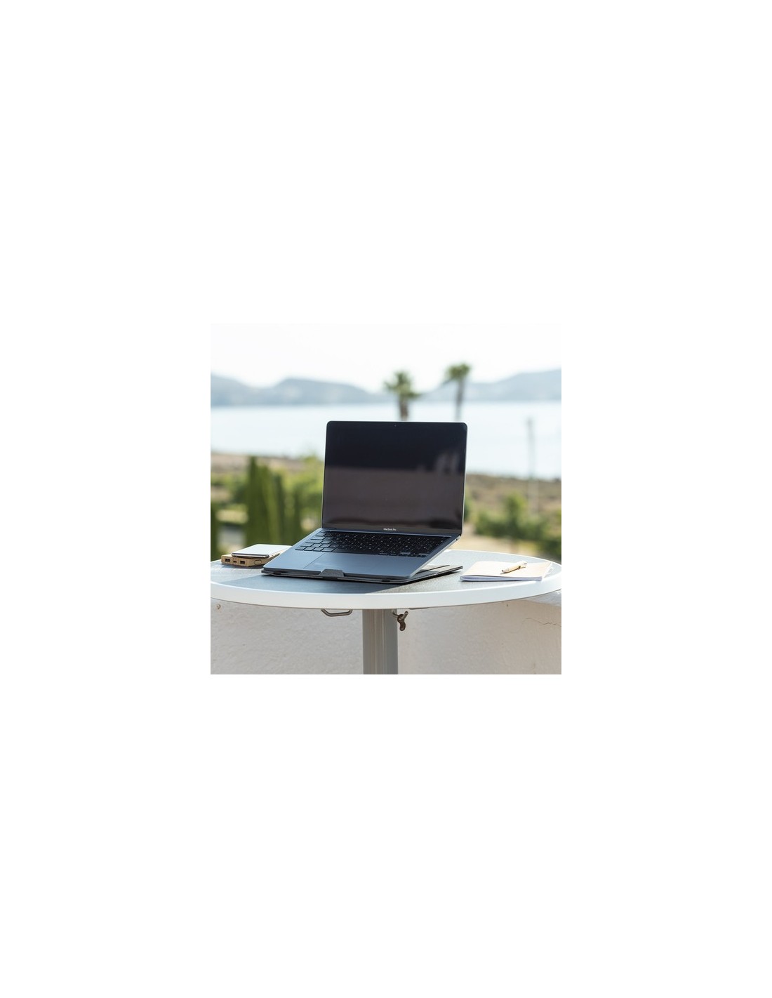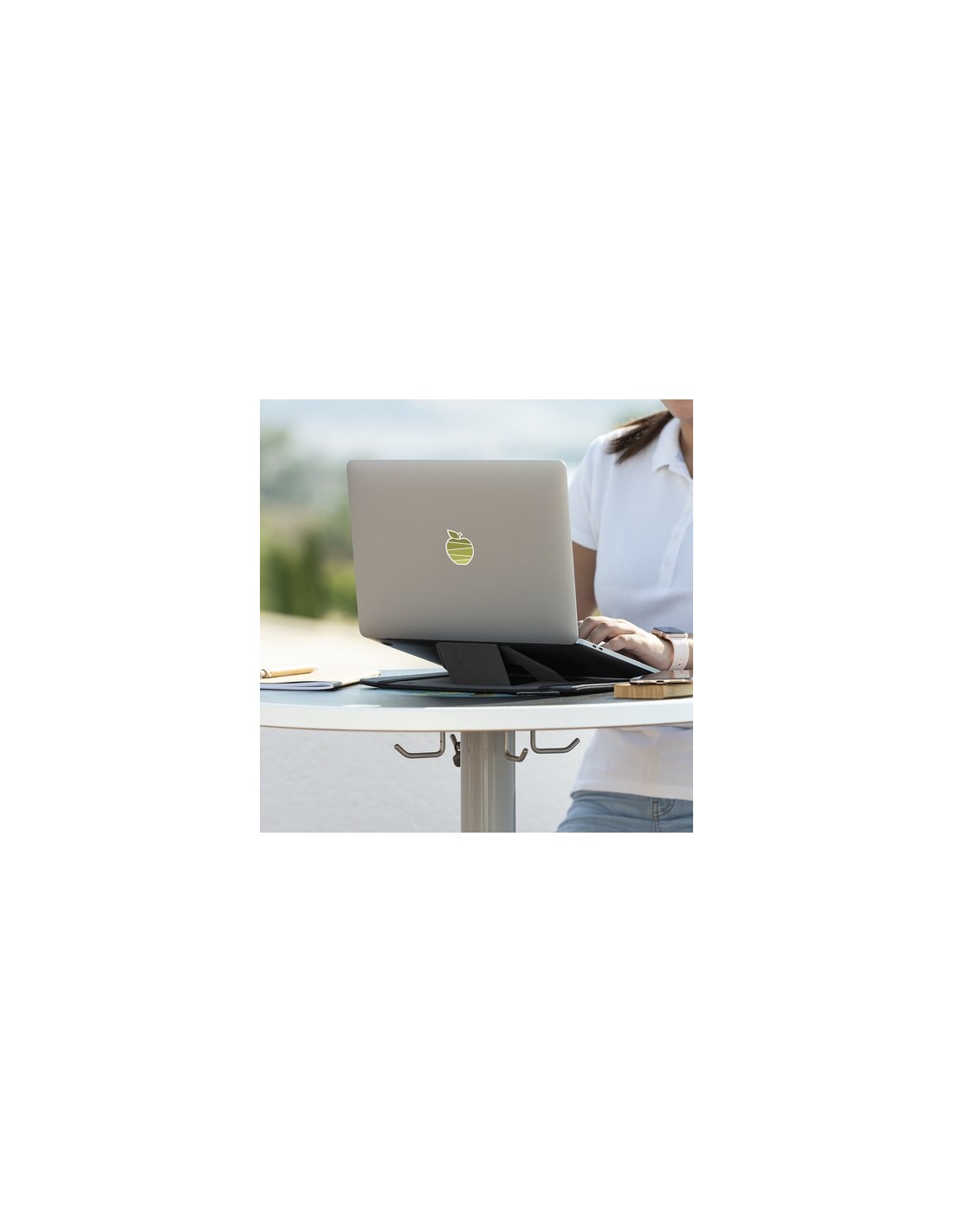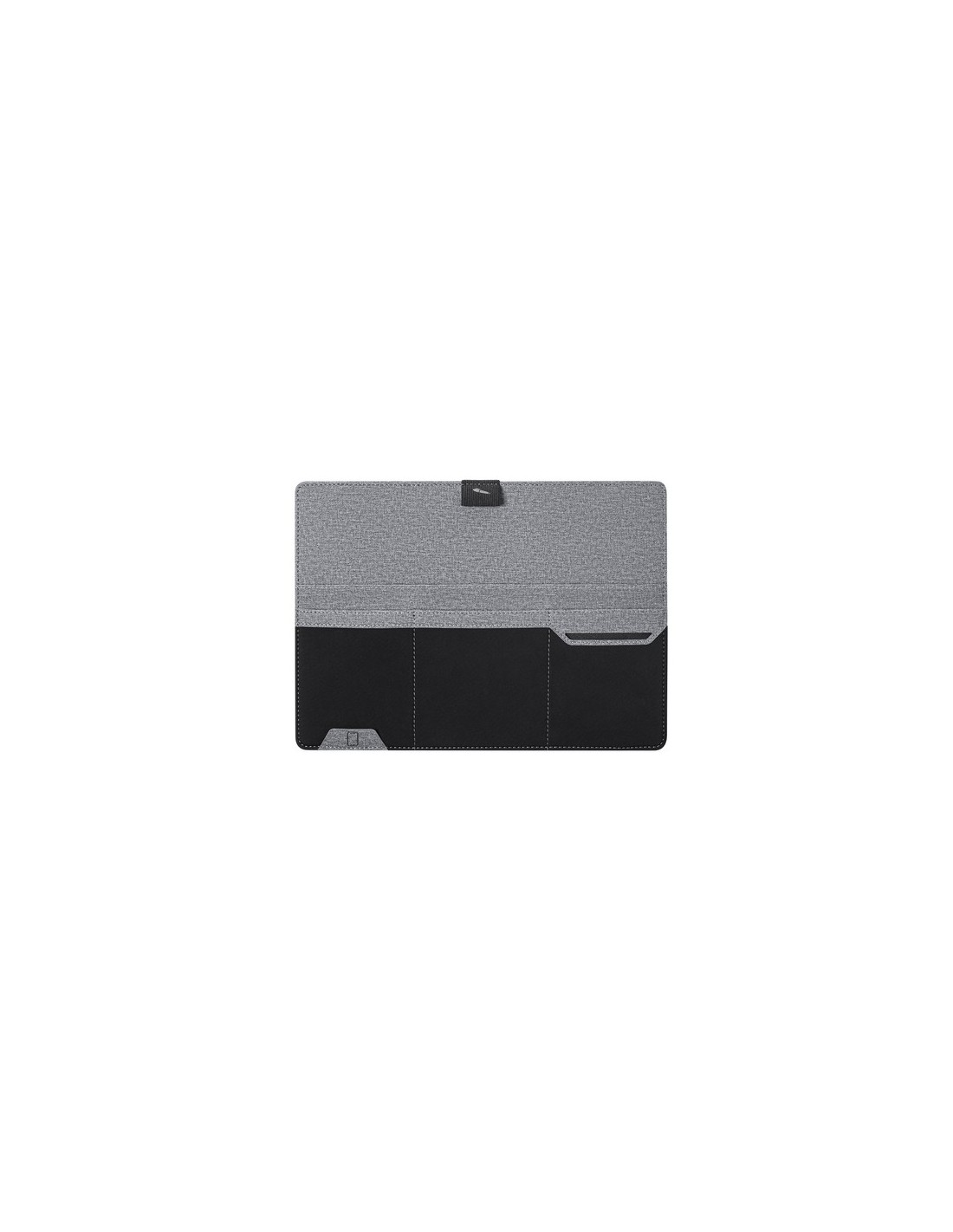 Elegante y práctico organizador con soporte imantado, ideal para facilitar el trabajo o uso de portátil en cualquier lugar o espacio. Fabricado en resistente poliéster gris jaspeado con detalles en polipiel de color negro. Incluye soporte para bolígrafo y smartphone, con 4 bolsillos elásticos para el almacenamiento de diferentes gadgets. Composition : Poliéster/ Polipiel.