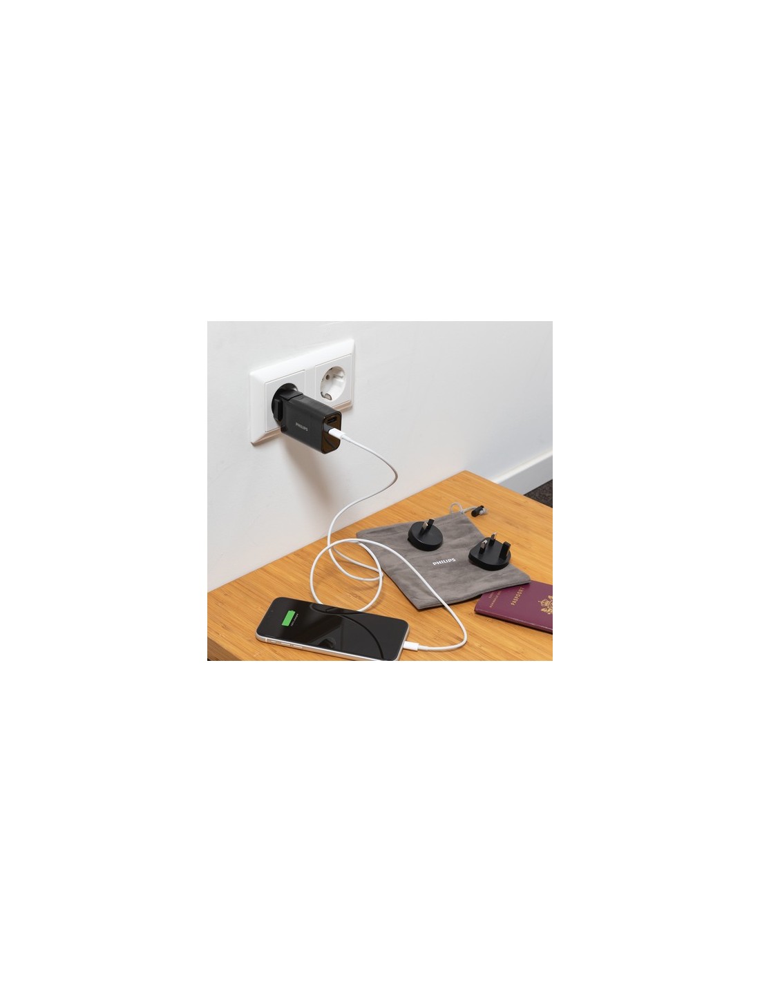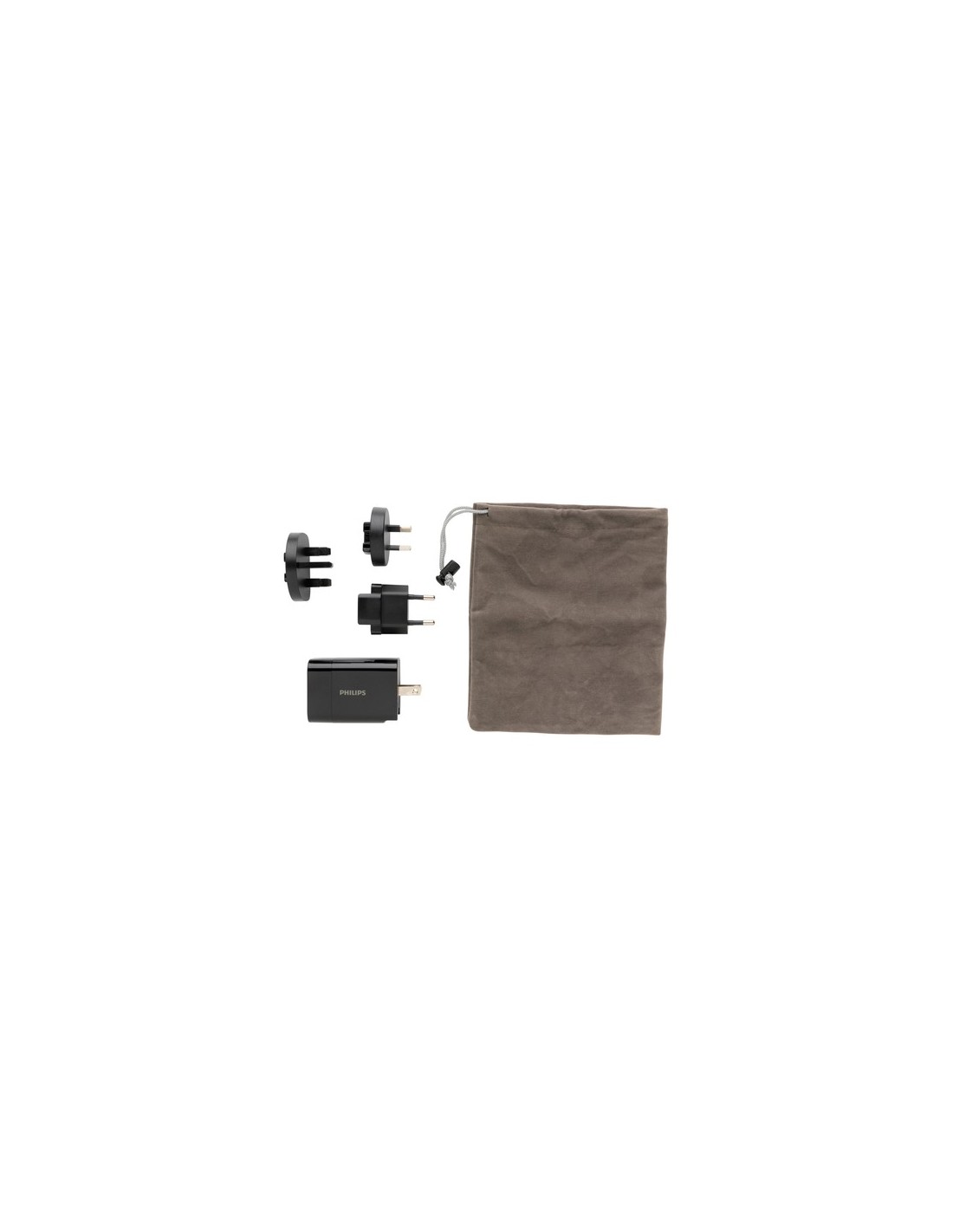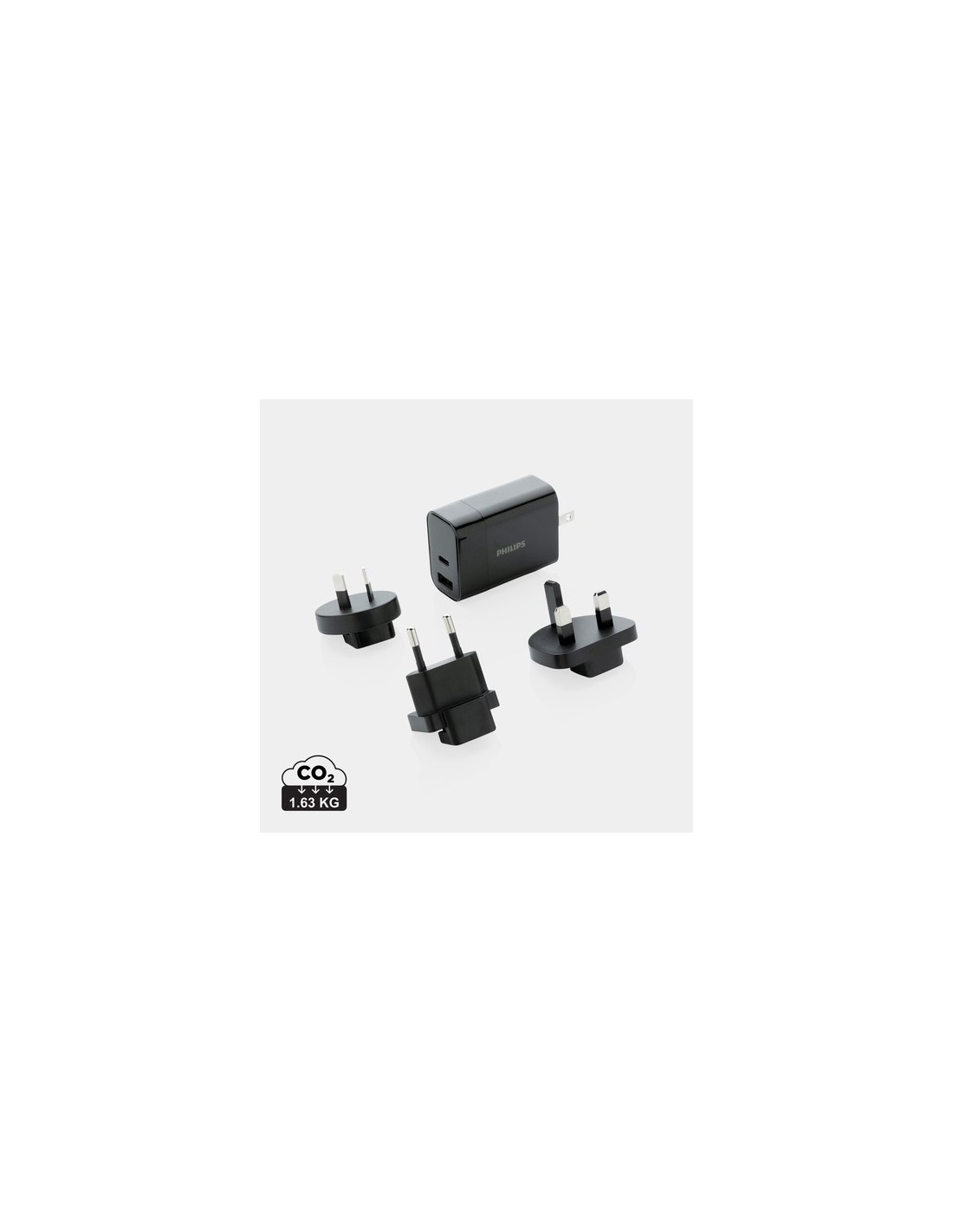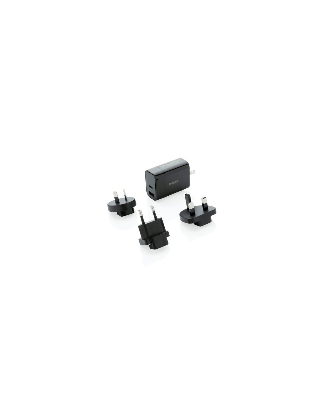 Cargador de viaje PD de 30W ultrarrápido Philips. Con una práctica bolsa de viaje. Viene con 4 enchufes; Enchufe estadounidense integrado y enchufes AU, Reino Unido y UE intercambiables. Entrada: 100-240V, 50-60Hz 0.7A Salida USB A 5V/2.4A Tipo-C 5V/3A, 9V/2A, 12V/1.5A. Presentado en caja de regalo Philips. Material : ABS Recycled Content Percent : 0 Conforme directiva Electromagnética 2014/30/EU, Conforme directiva bajo voltage 2014/35/EU, Conforme directiva de sustancias peligrosas 2011/65/EC & 2015/863, Conforme PAHS content in Reach & ZEK 01-4-08, Conforme directiva Phtalate content, Libre de parafinas cloradas de cadena corta y media. WEEE Packaging : Caja de regalo All print codes : Screen Transfer OS,Pad Print,Digital Transfer OS - Print code default : Serigrafía por Transferencia - funda - 90 x 40 mm - max color : 6 Total CO2 emissions : 1,63.