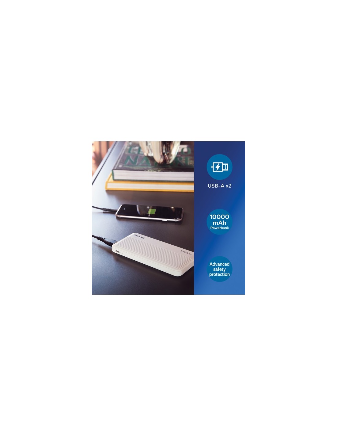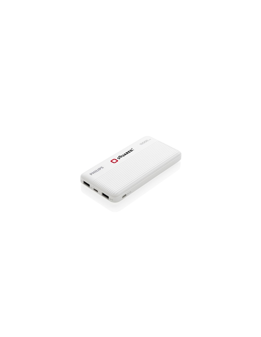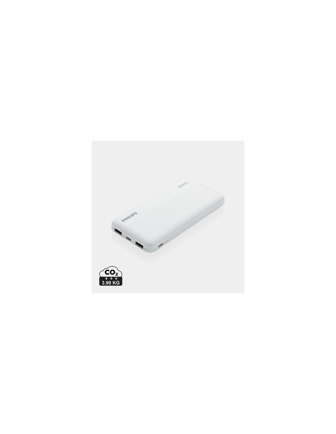 Powerbank Philips de 10.000 mAh con usb dual a output. Indicadores de potencia y protección de seguridad avanzada. Batería de polímero de litio de larga duración. Entrada Micro-usb: 5V/2A Entrada tipo C: 5v/2A Salida USB-A: 5V/1A USB-A2: 5V/2.1A. Presentado en caja de regalo Philips Material : ABS Recycled Content Percent : 0 Conforme directiva de sustancias peligrosas 2011/65/EC & 2015/863, Conforme directiva Electromagnética 2014/30/EU, Conforme directiva Phtalate content, Conforme directiva Battery transportation safety UN38.3, Certificado para transporte aéreo, Conforme directiva seguridad baterias Alcalinas EN62133, Hoja de datos de seguridad del material disponible, Conforme directiva EN60950-1 a la protección contra descargas eléctricas y peligros de energía, Libre de parafinas cloradas de cadena corta y media., Conforme PAHS content in Reach & ZEK 01-4-08 WEEE Battery : 1 Li-poli - 170 g. Packaging : Caja de regalo All print codes : Pad Print,Digital Print 2 - Print code default : Tampografía - parte frontal/alta del artículo - 60 x 10 mm - max color : 5 Total CO2 emissions : 3,9.