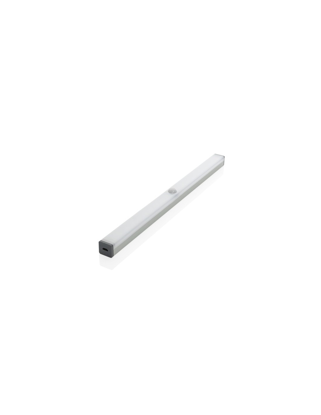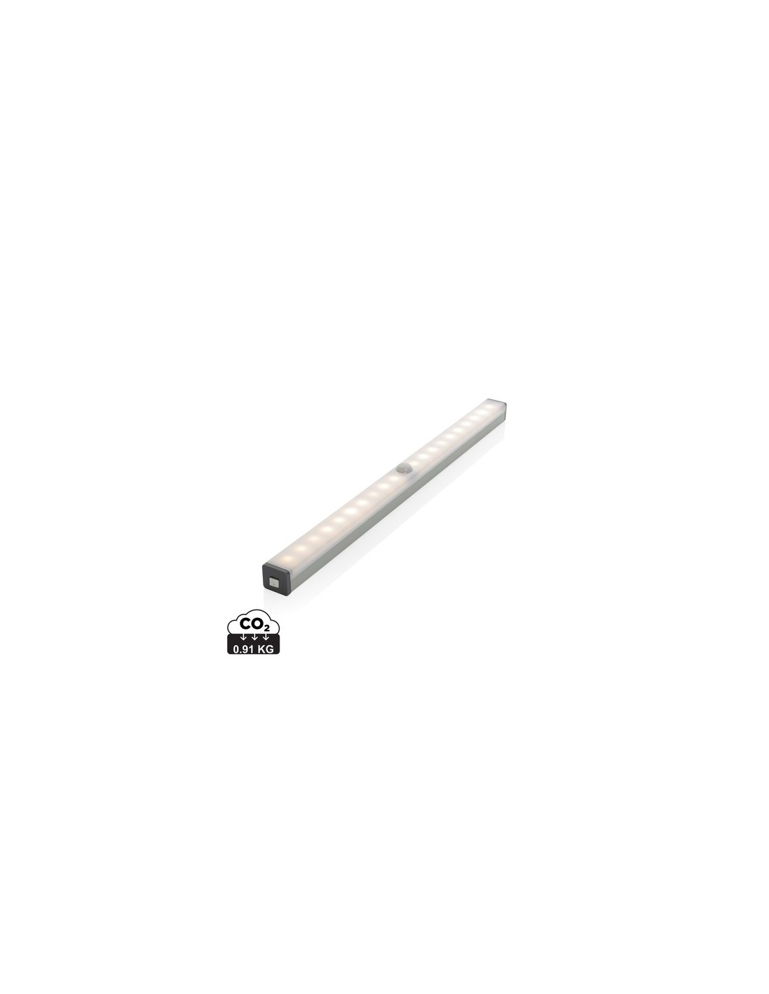 Sensor de movimiento LED de aluminio con 20 LED. Con reverso magnético para sujetarlo a superficies metálicas. Incluye 2 imanes con adhesivo para fijar a superficies no magnéticas. Perfecto para usar en el garaje, encima de tu escritorio, en el pasillo o en tu armario. Dos modos: detección continua o automática del sensor. La luz LED se encenderá cuando detecte movimiento y se apagará después de 35 segundos si ya no se detecta movimiento. Con batería de litio de 500 mah para uso continuo hasta 3,5 horas y distancia del sensor hasta 3 metros. 30 lúmenes. USB recargable con el cable micro USB sin PVC incluido. Material : Aluminio, PC Recycled Content Percent : 0 Conforme directiva Electromagnética 2014/30/EU, Conforme directiva de sustancias peligrosas 2011/65/EC & 2015/863, Conforme PAHS content in Reach & ZEK 01-4-08, Conforme directiva Phtalate content, Libre de parafinas cloradas de cadena corta y media. Battery : 1 Li-poli - 6 g. Packaging : Caja de regalo All print codes : Pad Print,Laser Engraving 2 - Print code default : Tampografía - parte frontal e izquierda del artículo - 70 x 5 mm - max color : 5 Social Audits : BSCI Total CO2 emissions : 0,91.