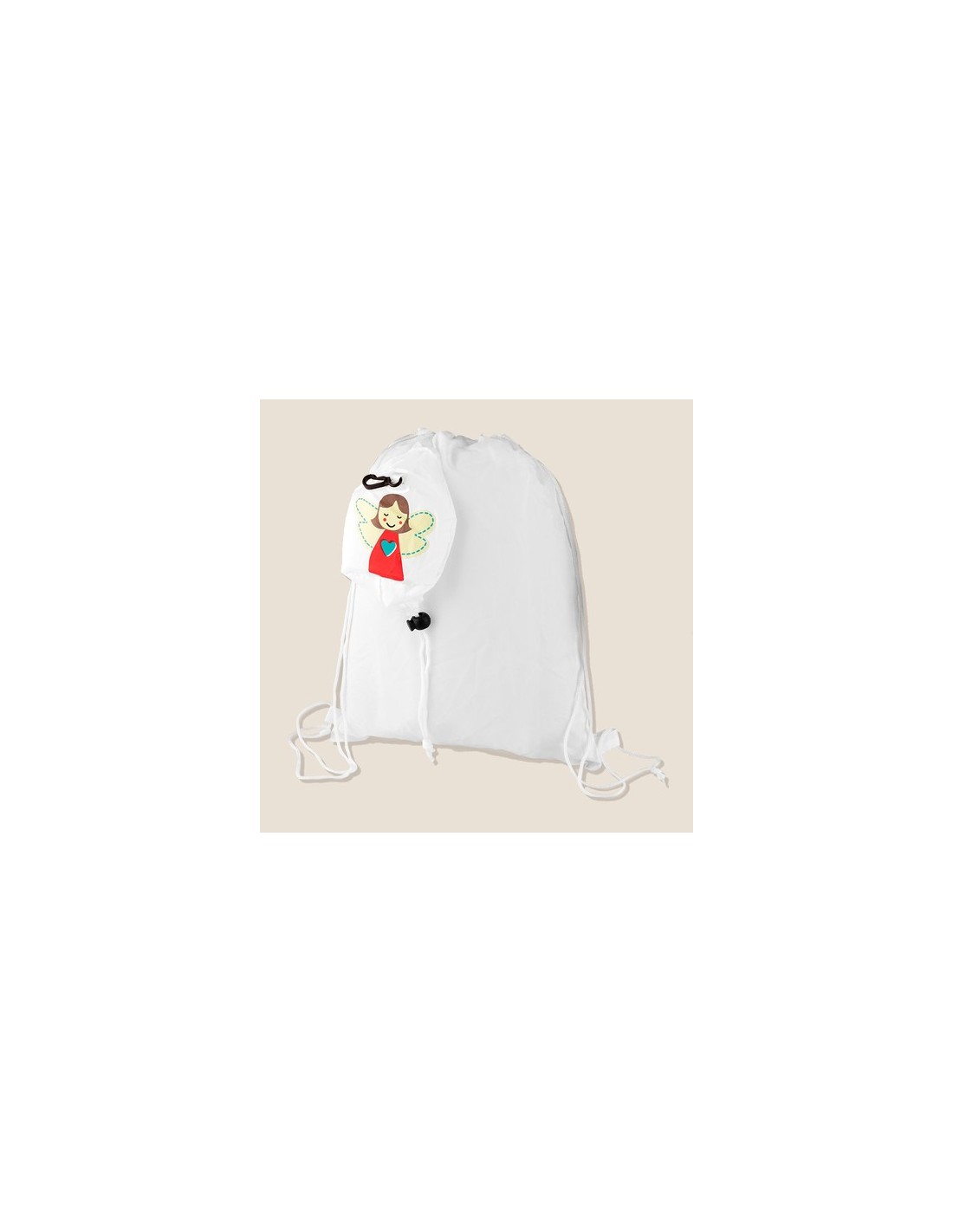 Bolsa mochila con cierre de cintas ajustables, fabricada en poliéster 190T. Se pliega y guarda en una bolsita pequeña, con un ángel grabado. Material : Poliéster 190T Tecnica De Marcaje : CODIGO C SERIGRAFIA A 1 COLOR