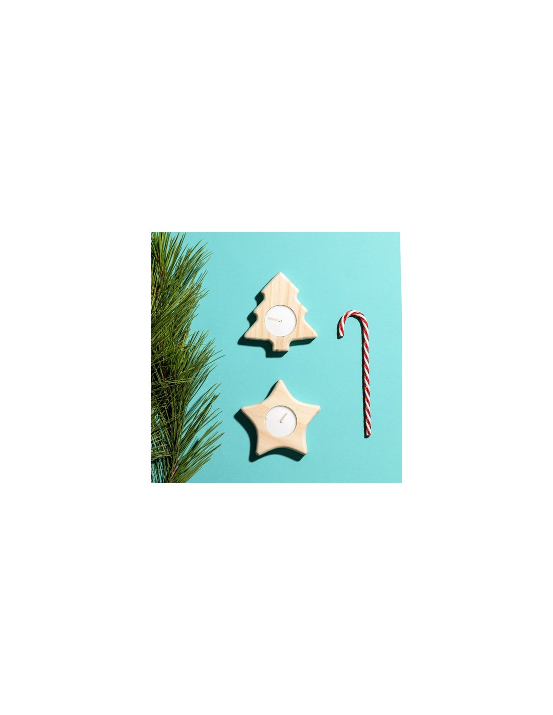 Vela de navidad de madera de pino con originales diseños de estrella y arbolito. Presentada en cajita blanca individual. Composition : Madera.