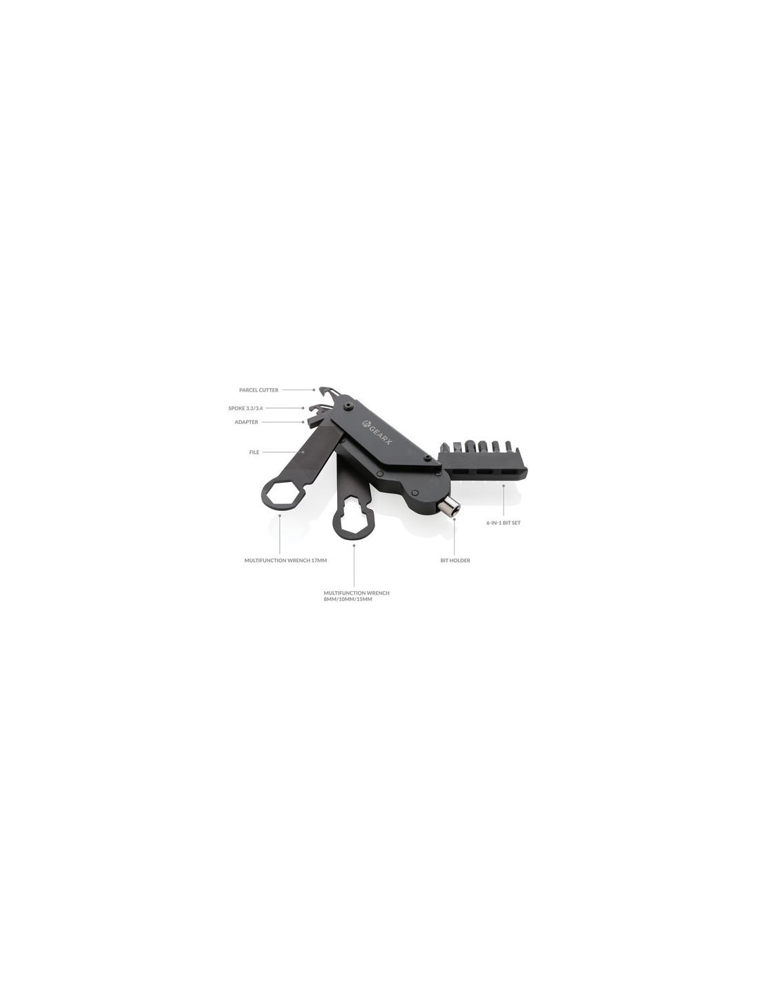 Si tienes que reparar tu bicicleta, asegúrate de hacerlo con estilo. Esta herramienta de primera calidad viene con todas las herramientas necesarias para arreglar tu bicicleta en poco tiempo. El cuerpo de aluminio se combina con herramientas de acero inoxidable 420 de primera calidad, todas completamente negras. Las herramientas son muy duraderas. Las 16 funciones incluyen: asa de puntas, portapuntas integrado (S2.5, S2 5 mm, S2 4 mm, S3 3 mm, S2 6 mm, S2 PH2), radio 3.4/3.3, cortador, adaptador, llave multifunción con bloqueo, llave multifunción 15/10/8 mm con cerradura, lima. Presentado en caja de regalo de lujo. Nivel de dureza de la broca 60-62 HRC. Nivel de dureza de las herramientas 40-45 HRC. Material : Acero inoxidable Recycled Content Percent : 0 Libre de parafinas cloradas de cadena corta y media., Conforme directiva Phtalate content, Conforme PAHS content in Reach & ZEK 01-4-08, Conforme contenido de plomo U.S, Conforme directiva Cadmio 91/338/EC Packaging : Caja de regalo All print codes : Laser Engraving 2,Pad Print - Print code default : Grabado a láser - parte trasera - 45 x 15 mm - max color : 1 Social Audits : BSCI Total CO2 emissions : 2,83.