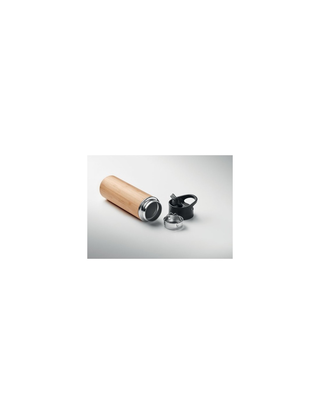 Botella de acero inoxidable de doble pared aislado al vacío con tapa y asa para transporte en PP. Capacidad: 450 ml. Anti fugas. El bambú es material natural, el color del articulo puede variar.