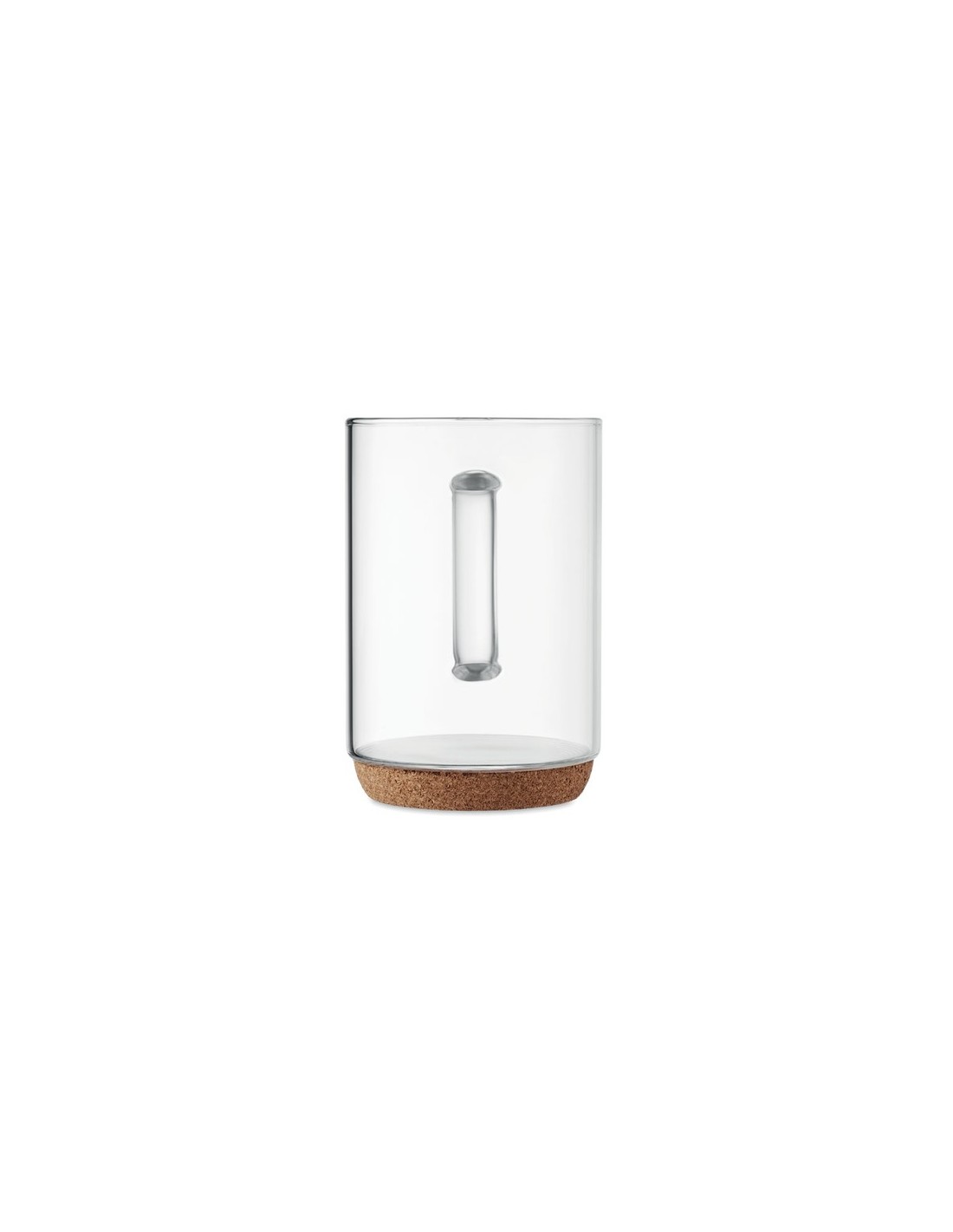 Taza de cristal de borosilicato con base de corcho. Capacidad: 400 ml. El corcho es un material natural, debido a su naturaleza estructural y porosidad superficial, el resultado final de la impresión por artículo puede tener desviaciones.