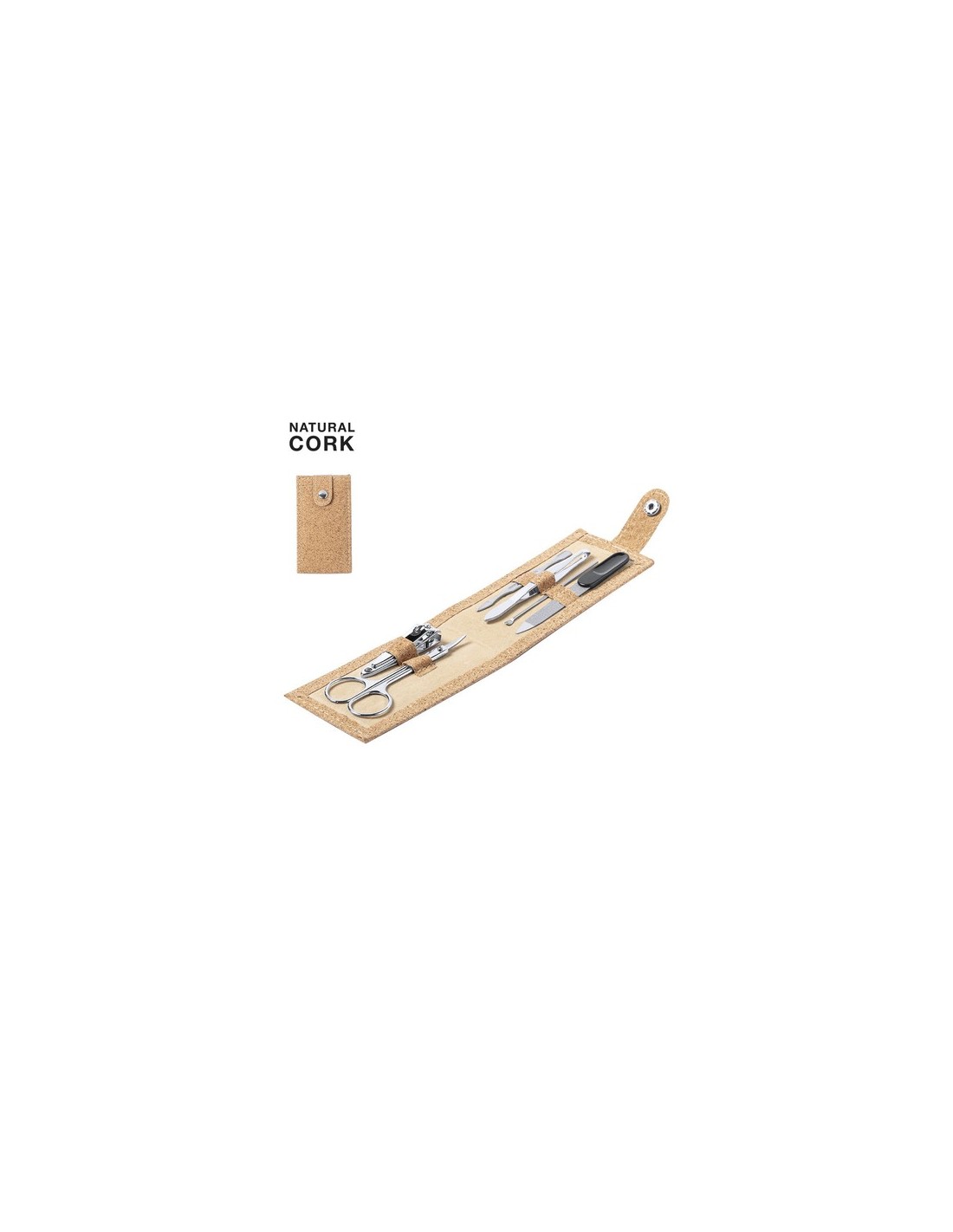 Set de manicura de línea nature con funda fabricada en corcho, para así fomentar la utilización de materias primas naturales y reducir las emisiones contaminantes. Incluye 6 accesorios de acero inox: tijeras, pinzas, cortaúñas, lima y 2 quitacutículas. Soportes interiores para accesorios y cierre de corchete. Totalmente desplegable para fácil marcaje. 6 Accesorios Composition : Corcho.