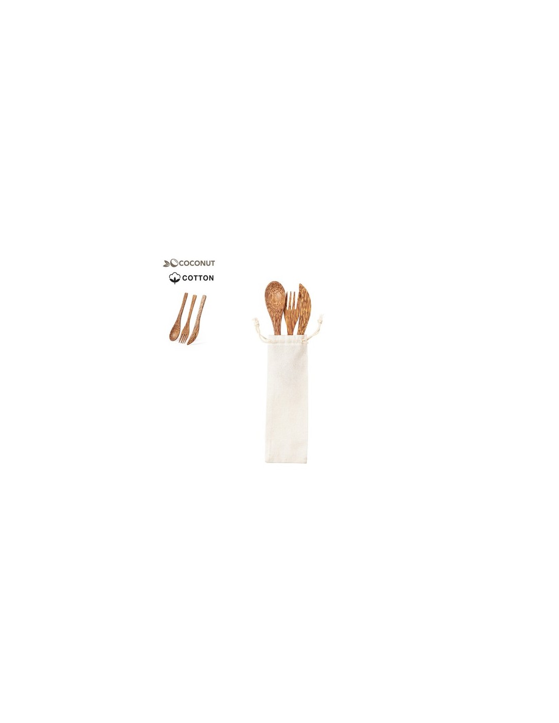 Set de cubiertos reutilizables de línea nature fabricados en coco. Tras el consumo de su fruto, del coco y su planta se pueden obtener multitud de productos, contribuyendo a la sostenibilidad del planeta y fomentando el uso de materias primas naturales. Incluye cuchara, cuchillo y tenedor. Presentados en bolsita individual de algodón con cierre de cordón. 3 Piezas. Funda Algodón Composition : Coco.