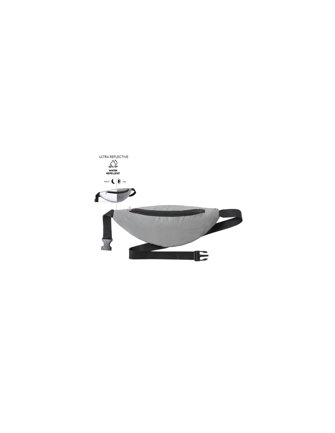 Riñonera en resistente poliéster 210T. Fabricada empleando tejido con gran capacidad para reflejar intensamente la luz, gracias a millones de pigmentos reflectantes y basándose en el principio de la retro-reflexión de la luz, una propiedad de visibilidad nocturna que consiste en la refracción de la luz hacia la fuente de origen de la misma. Con bolsillo de cierre de cremallera y cinta con cierre de hebilla ajustable. Diseñada para el día a día y actividades de ocio. Resistente al agua. Reflectante Composition : Poliéster 210T.