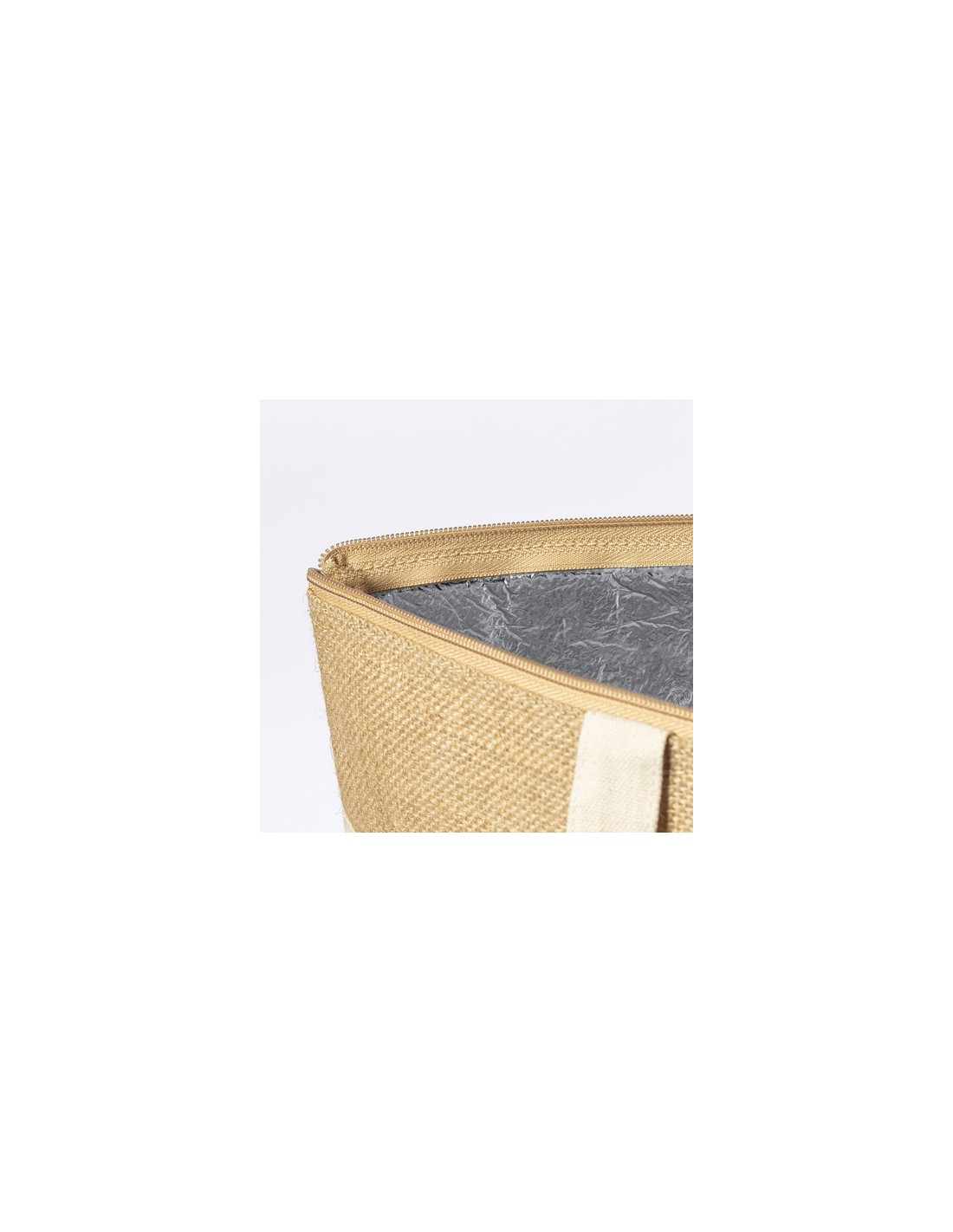 Bolsa térmica en resistente material 100% algodón de 225g/m2, con parte superior en yute laminado y asas de algodón. Compartimento principal con cierre de cremallera y tirador metálico, con interior isotermo de aluminio. De acabado cosido, con asas medianas reforzadas y resistencia hasta 7kg de peso. Composition : 100% Algodón/ Yute Laminado/ Aluminio.