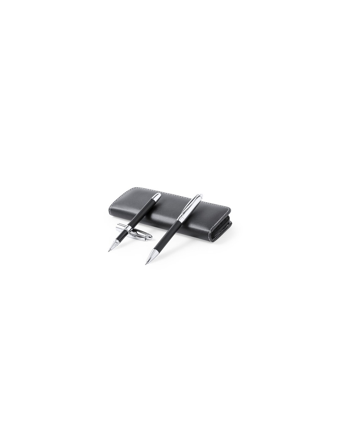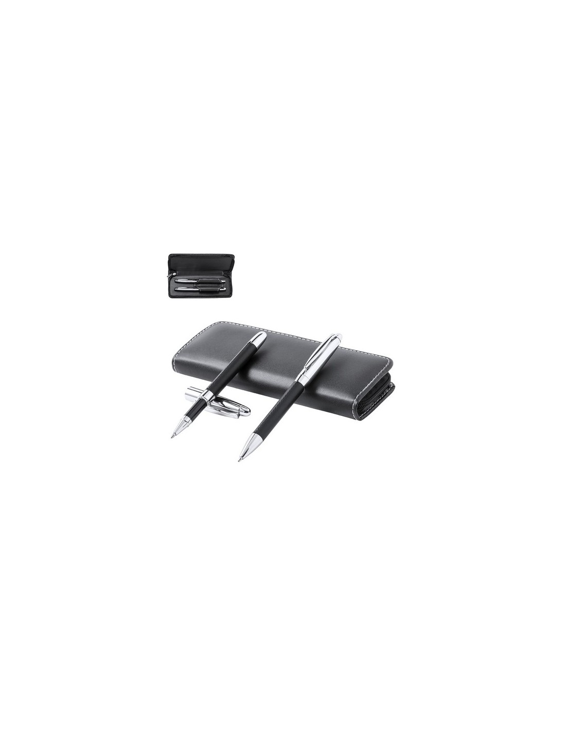 Set premium de bolígrafo y roller. Fabricado en elegante combinación de polipiel en tonos negros y metal cromado. Bolígrafo de mecanismo giratorio en tinta azul y con cartucho jumbo. Roller con capucha y tinta gel en azul, carga jumbo. Presentado en estuche individual de polipiel con cierre de cremallera e interior a juego con compartimentos individuales. Bolígrafo y Roller. Carga Jumbo Composition : Polipiel/ Metal.