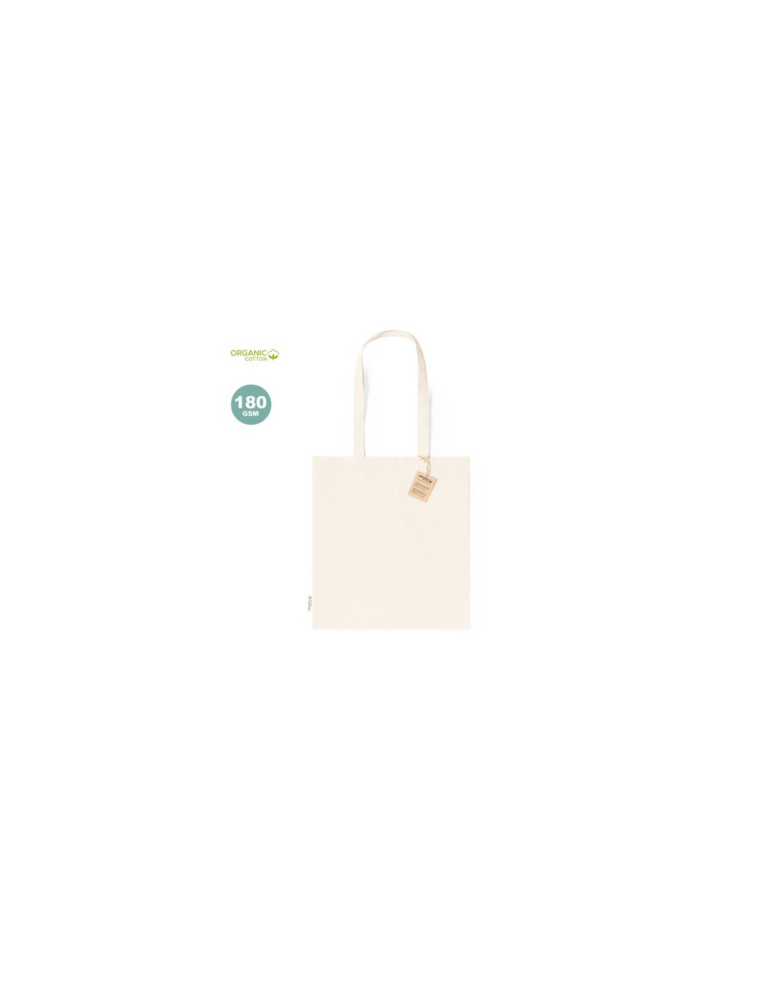 Bolsa fabricada en material100% algodón orgánico de 180g/m2 y en tono natural. De acabado cosido, con asas medianas reforzadas de 70 cm. Resistencia hasta 8kg, incluida etiqueta con distintivo de algodón orgánico y hangtag en cartón reciclado. Composition : 100% Algodón Orgánico 180 g/ m2.
