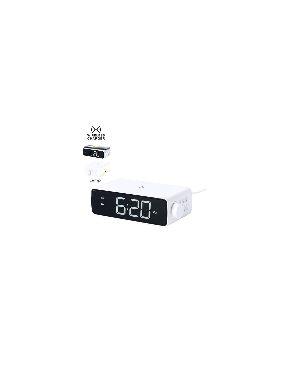 Reloj multifunción de elegante diseño en color blanco con cargador inalámbrico de 10W integrado y lámpara led integrada. Con función fecha/hora, alarma y lámpara de 36 ledes con intensidad de luz regulable. Conexión USB, con cable Tipo C incluido de 100 cm y alimentación auxiliar a pilas de botón (incluida). Compatible con dispositivos equipados con tecnología de carga inalámbrica. Presentado en atractiva caja de diseño.En cumplimiento con los requisitos de seguridad: Sistema de protección contra sobrecalentamiento. Sistema de protección contra sobrecarga. Lámpara 36 Ledes. Intensidad de Luz Regulable. Cargador Inalámbrico 10W. Conexión USB