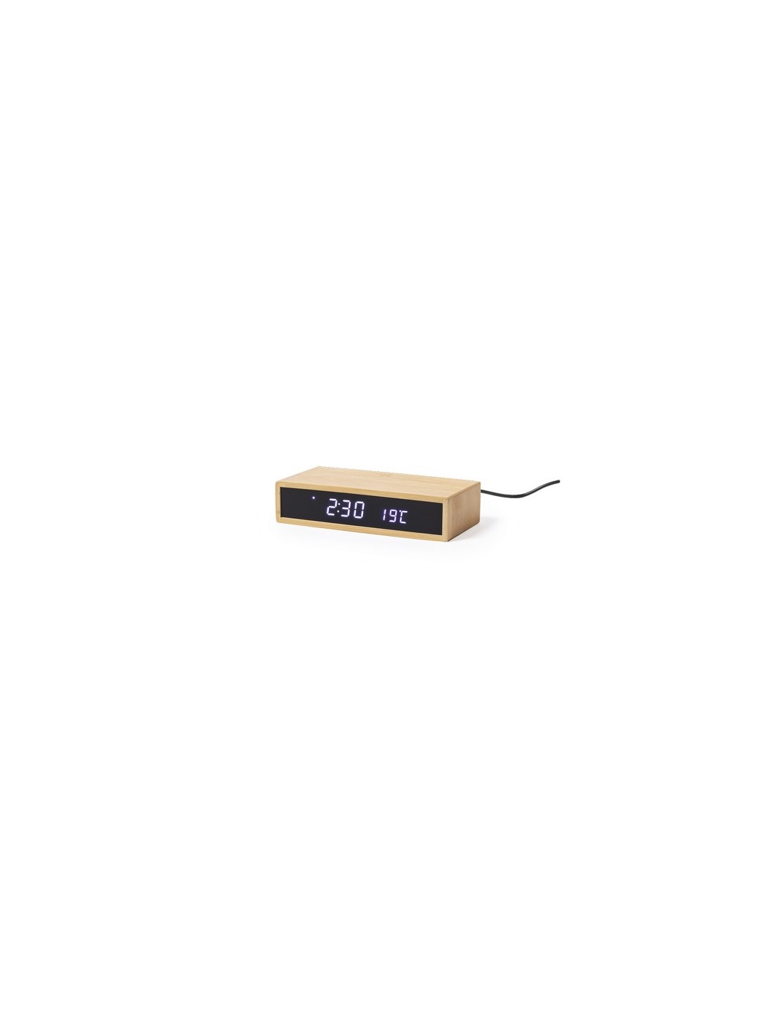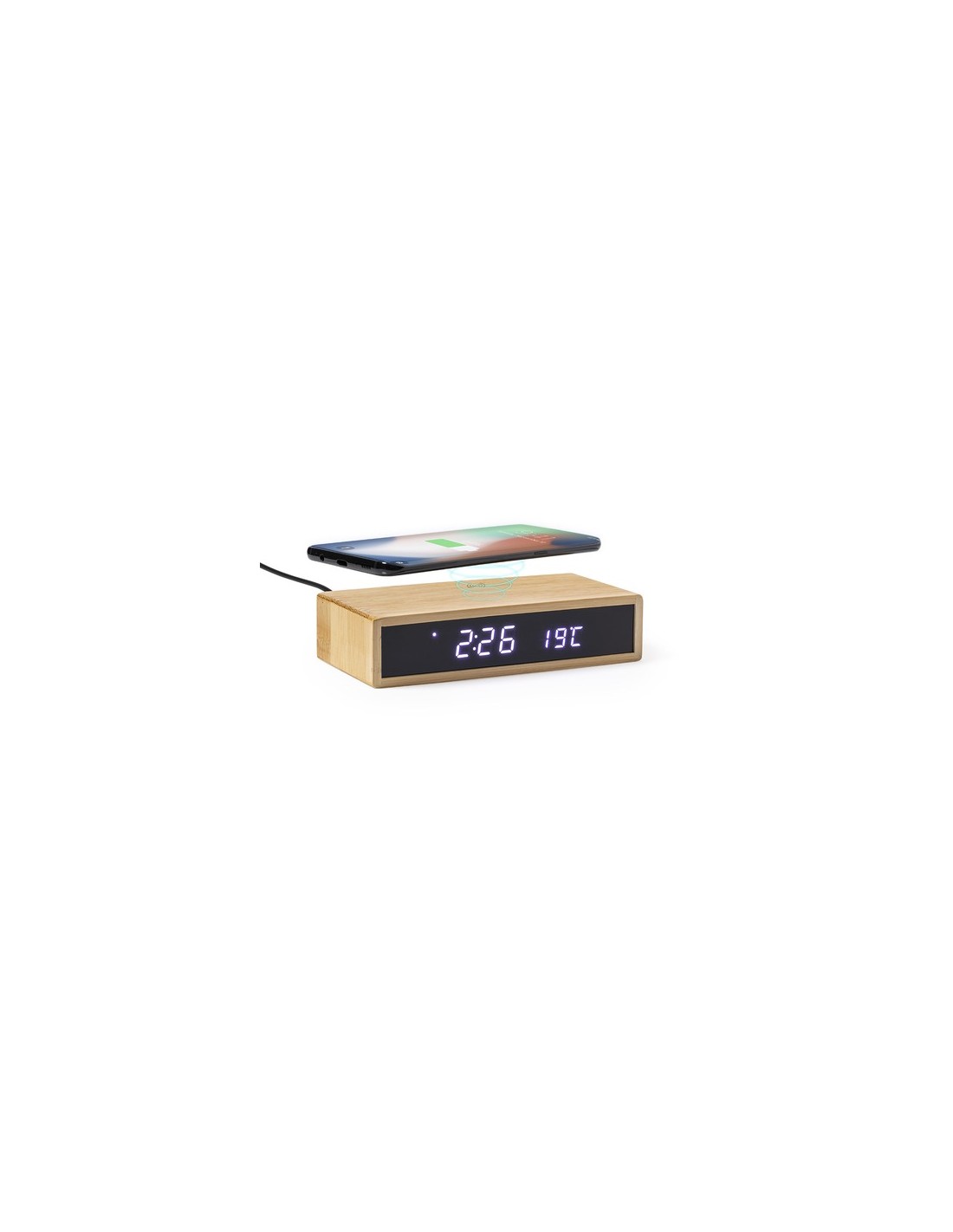 Reloj multifunción de línea nature, con cargador inalámbrico 5W integrado. Fabricado en bambú procedente de cortes naturales. Función fecha y hora, alarma y termómetro. Alimentación mediante conexión USB, con cable micro USB y adaptador de pared incluido. Pila de botón incluida que permite guardar los datos en caso de desconexión. Compatible con dispositivos equipados con tecnología de carga inalámbrica y presentado en atractiva caja de diseño. Disponible manual de instrucciones en español e inglés. Cargador Inalámbrico 5W. Intensidad de Luz Regulable. Conexión USB Composition : Bambú.
