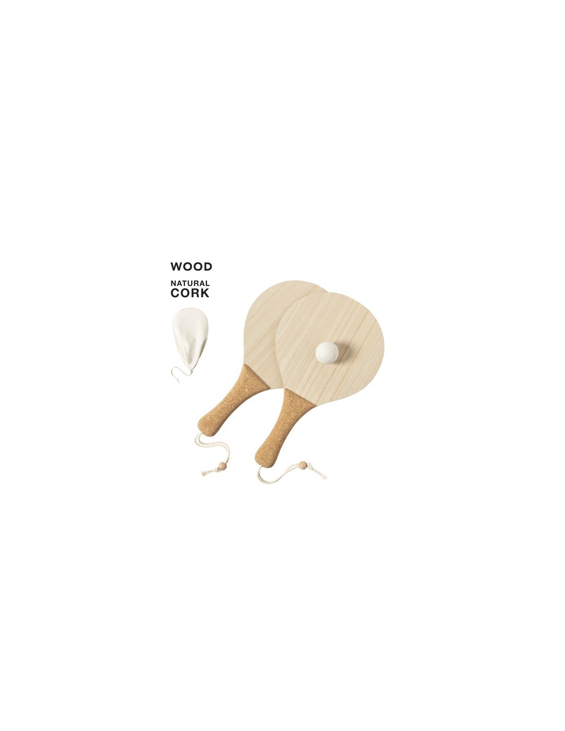 Par de palas de playa de línea nature. Fabricadas en madera, con mango reforzado en corcho natural y cintas para muñeca con ajustador. Presentadas en bolsa de algodón natural con cierre de cordón y pelota en caña de trigo. Funda Algodón Composition : Madera/ Corcho.