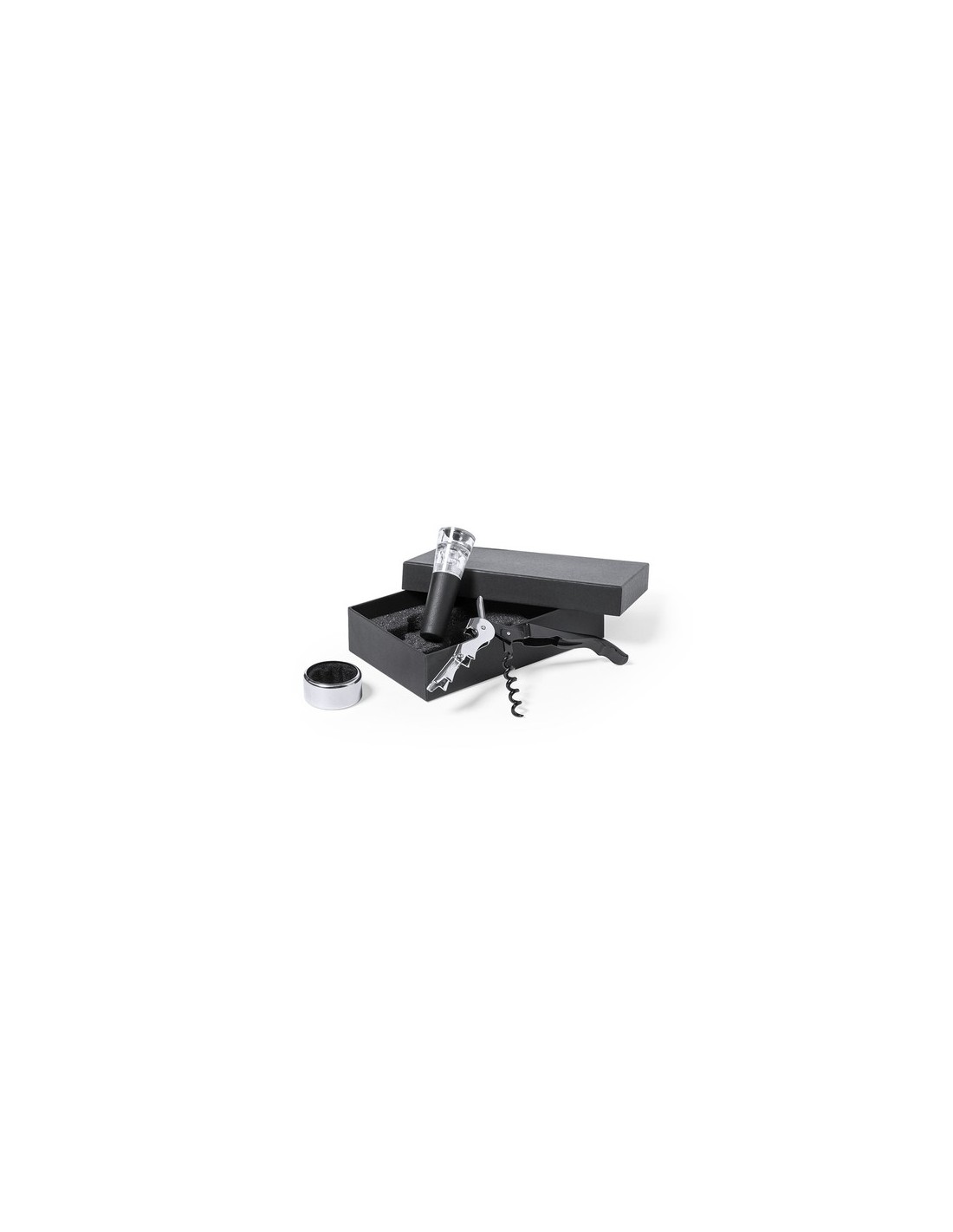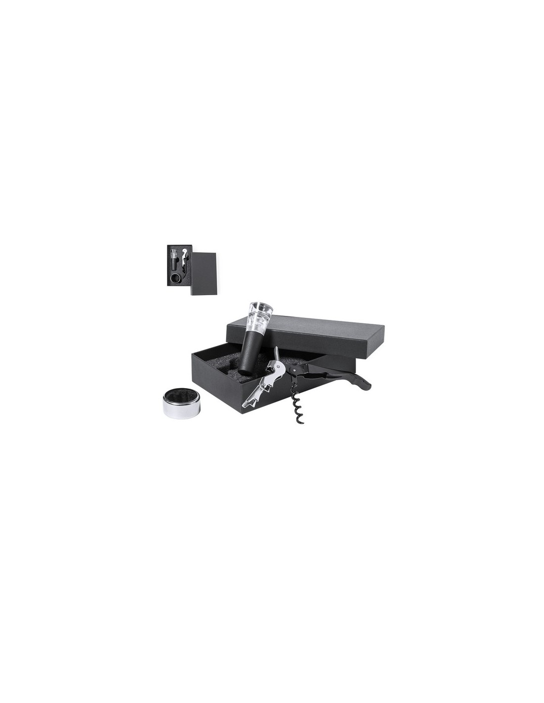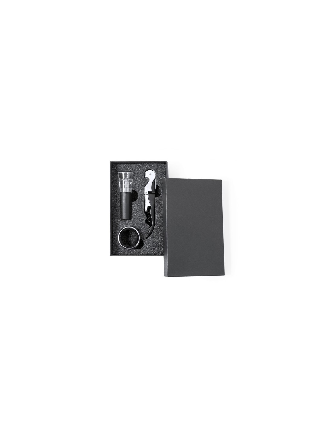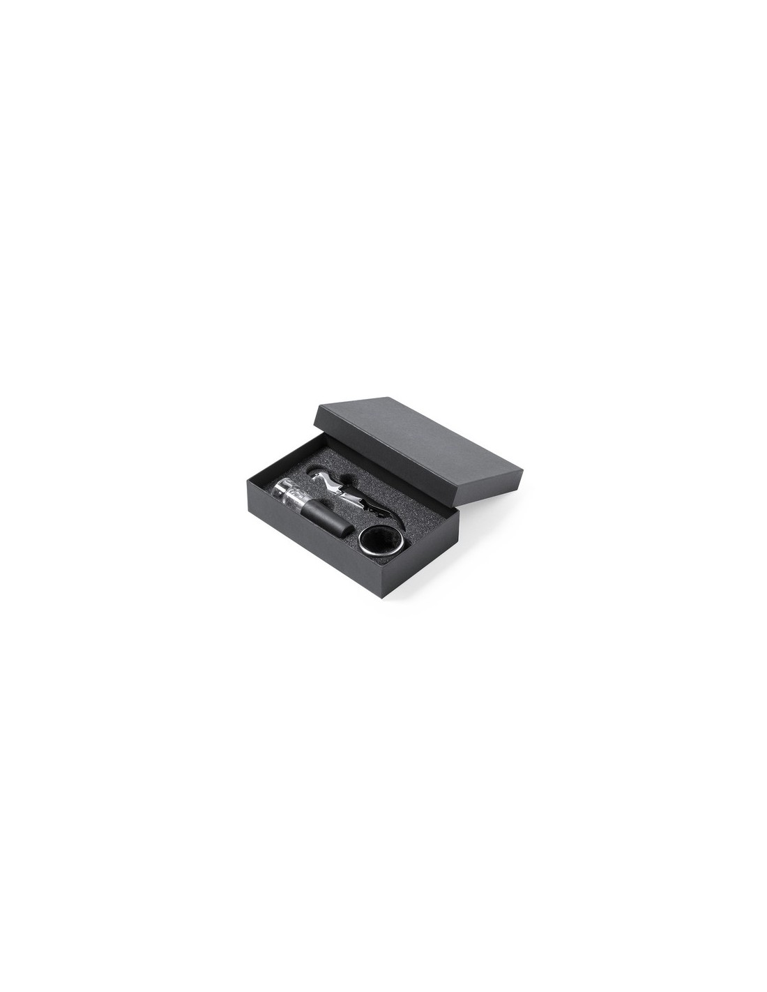 Completo set de vinos de sobrio acabado negro, presentado en estuche individual con interior troquelado de espuma y funda de protección en blanco. Incluye recogegotas, sacacorchos en acero inox y tapón bomba de vacío. 3 Accesorios Composition : Cartón.