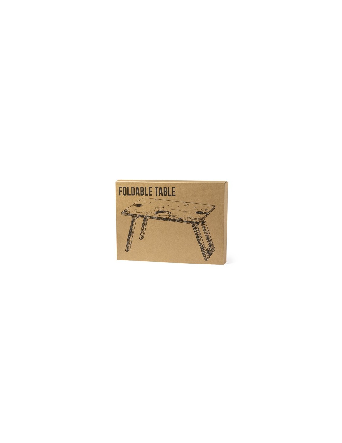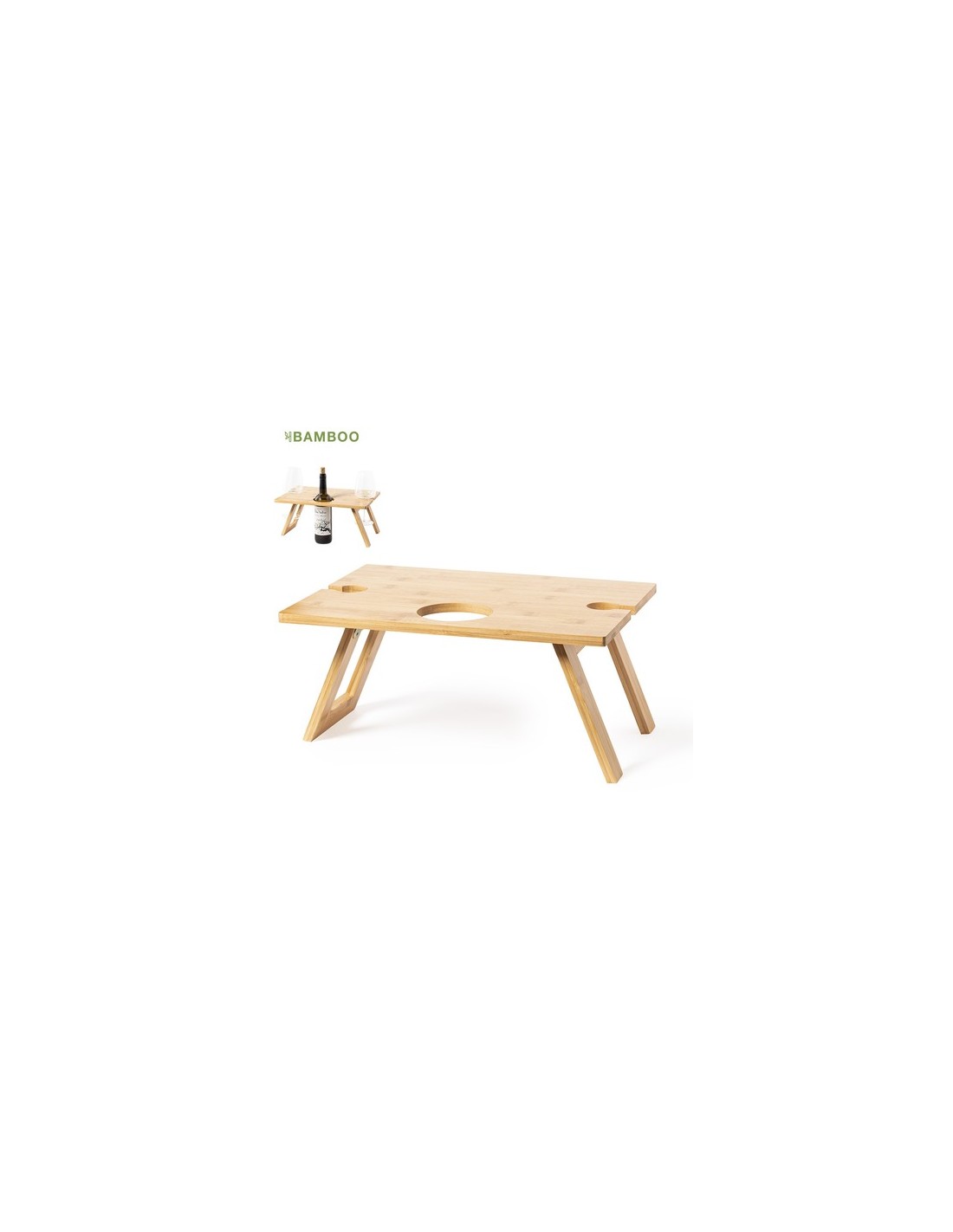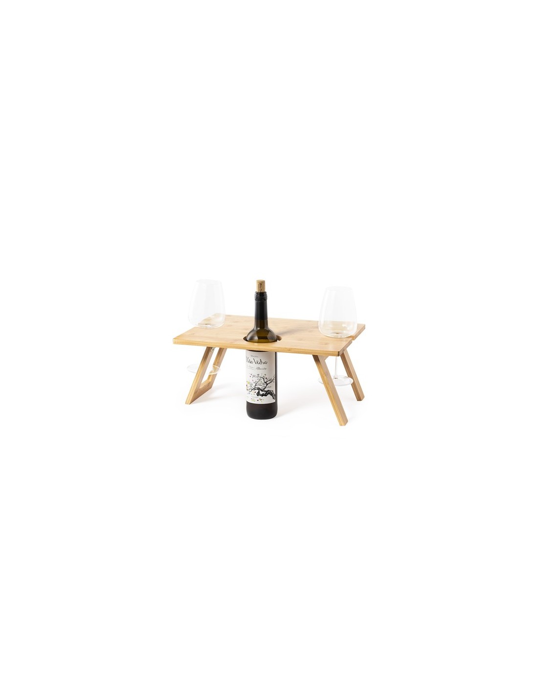 Mesa plegable para los aficionados al mundo del vino. Fabricada en bambú, incluye compartimento para botella de 75cl y 2 soportes para copa. De fácil plegado y tamaño compacto, presentada en atractiva caja individual de diseño eco. Plegable Composition : Bambú.