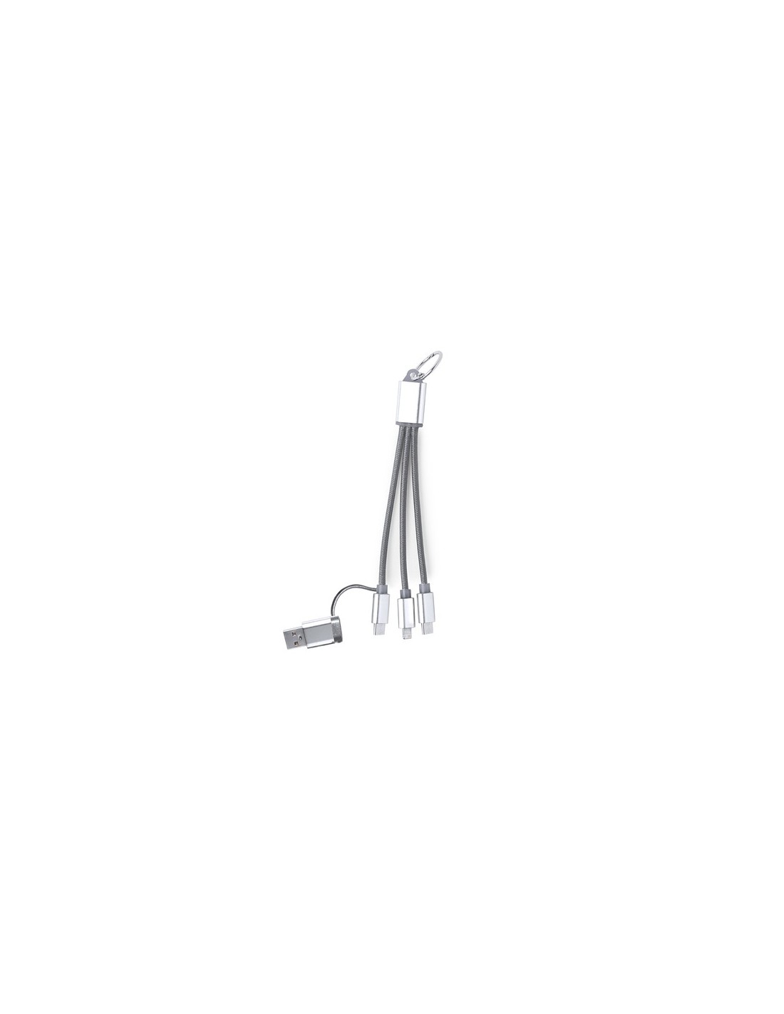 Cable cargador con conexión dual micro USB/Lightning y tipo C (entrada y salida). Conectores de aluminio y chapa especialmente diseñada para marcaje en láser. Conexión Micro USB, Tipo C y Lightning 5V DC 2.4A Composition : Aluminio.