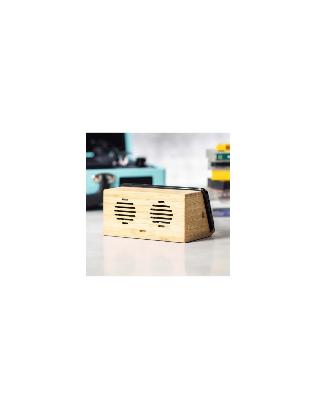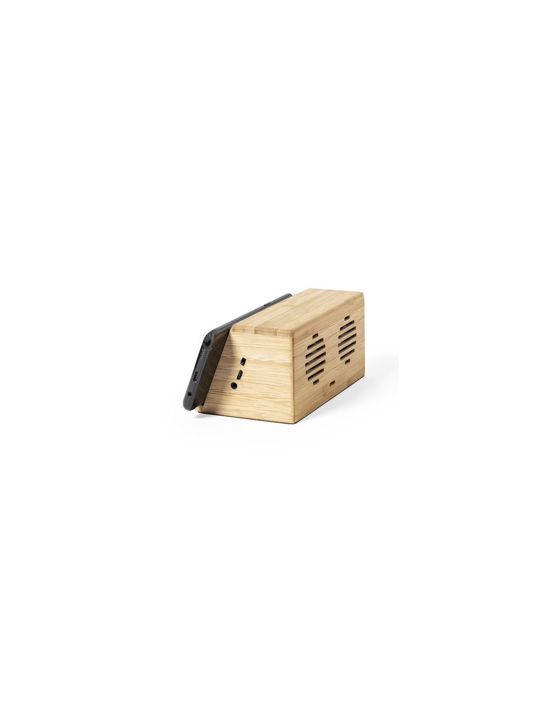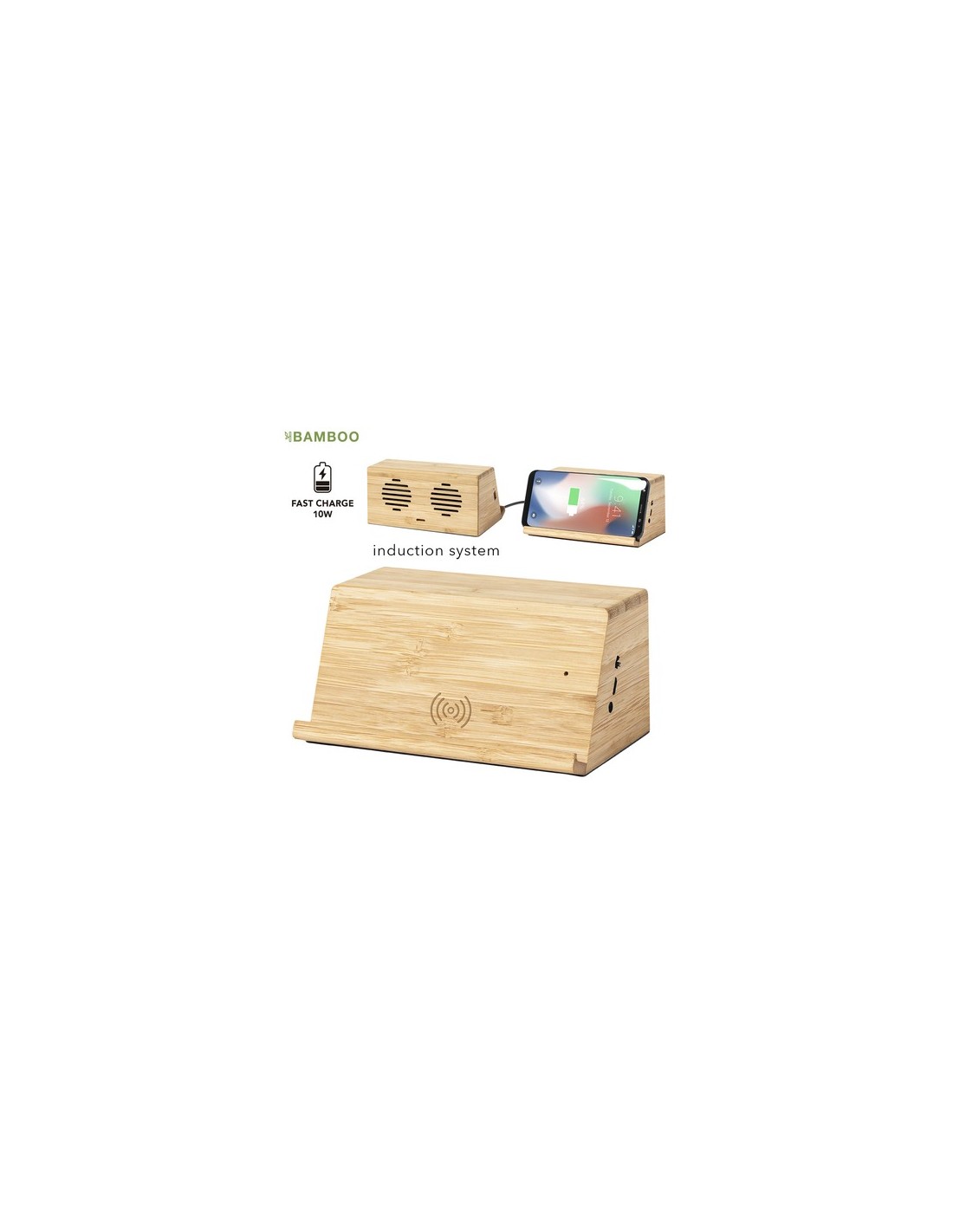 Altavoz cargador inalámbrico de inducción, de línea nature y carga 10W. Con soporte para smartphone integrado y 2 altavoces de 3W cada uno. Fabricado en bambú procedente de cortes naturales, con base antideslizante. Compatible con dispositivos equipados con tecnología de carga inalámbrica y recargable mediante cable USB -incluido-. Amplia superficie de marcaje y presentado en atractiva caja de diseño eco. Inalámbrico 10W. Conexión Inducción. Potencia Sonido 3Wx2. Batería 1.200 mAh Composition : Bambú.