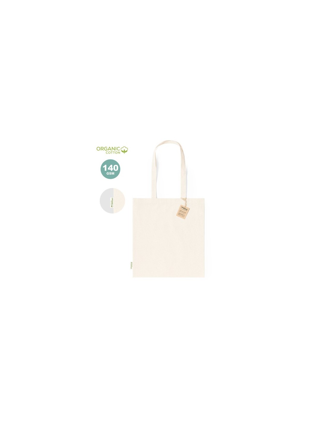 Bolsa fabricada en material100% algodón orgánico de 140g/m2 y en tono natural. De acabado cosido, con asas medianas reforzadas de 70 cm. Resistencia hasta 8kg, incluida etiqueta con distintivo de algodón orgánico y hangtag en cartón reciclado. Composition : 100% Algodón Orgánico 140 g/ m2.