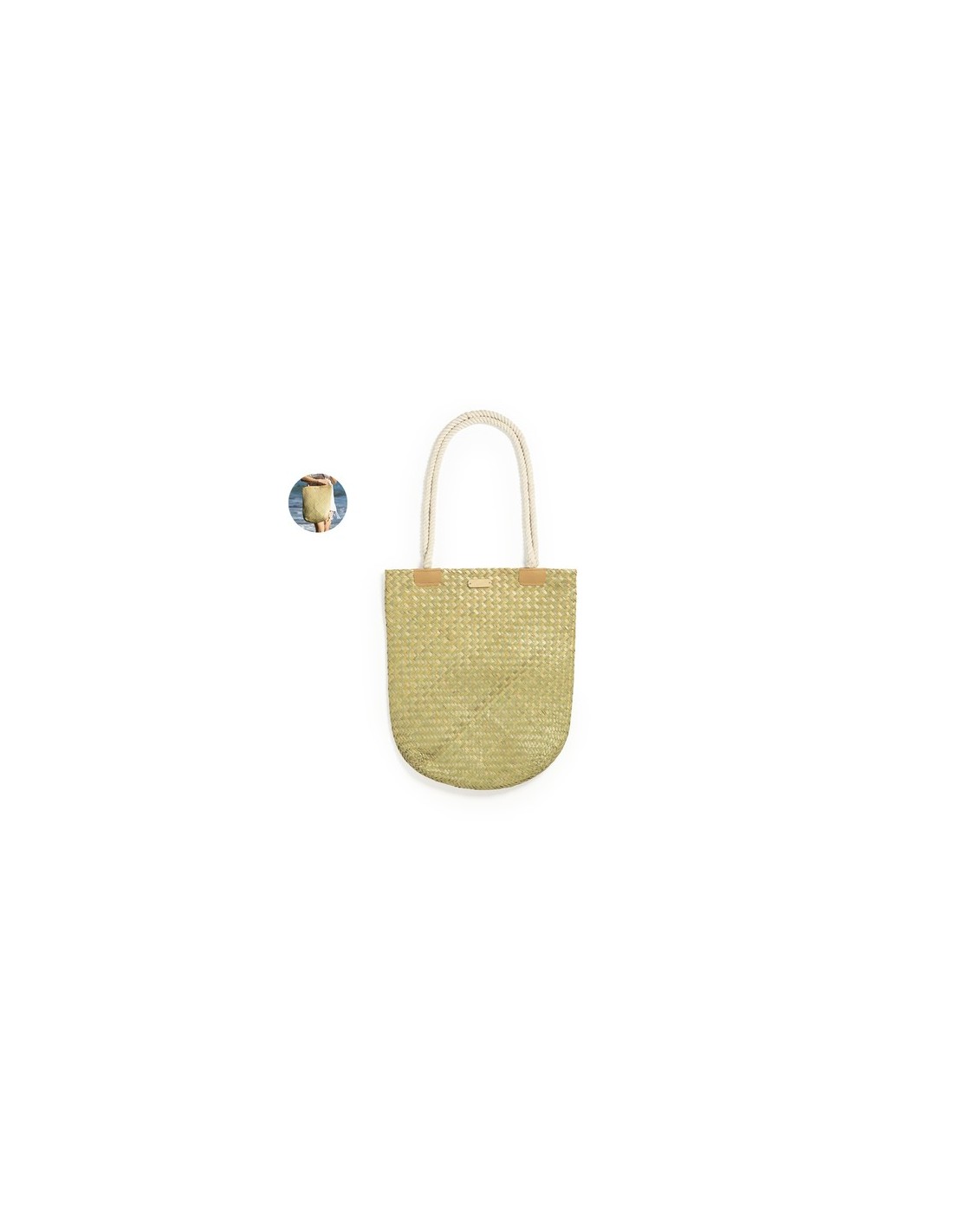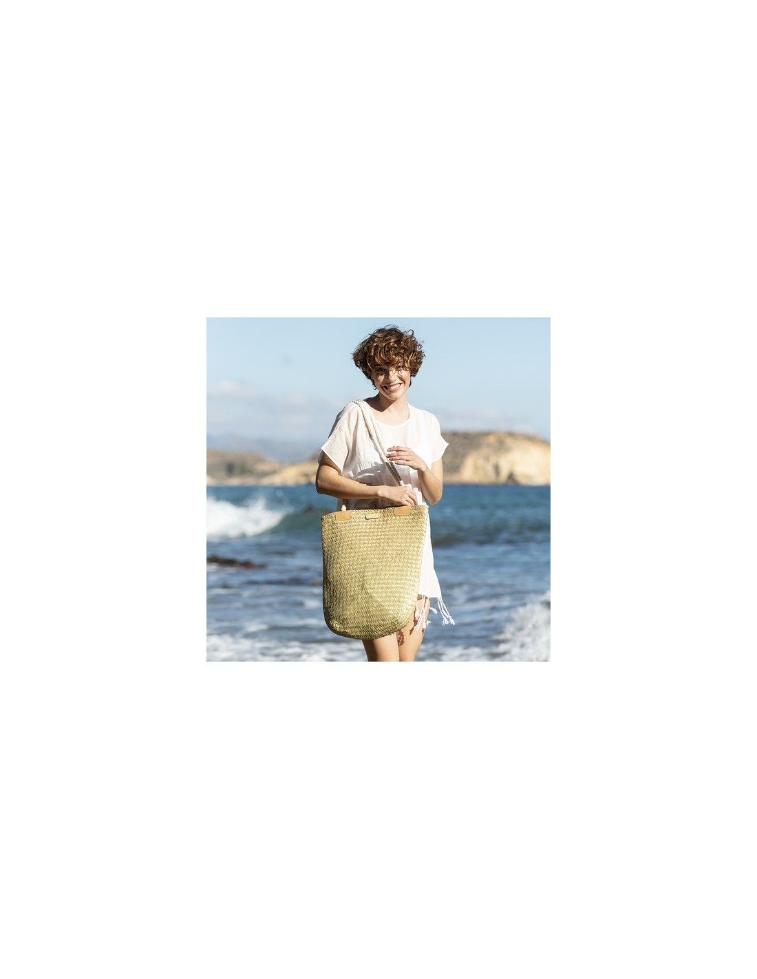 Bolso de desenfadado diseño en paja y con forma rectangular, un must. De gran capacidad y con originales asas largas en algodón, reforzadas en PU. Con superficie para personalización en madera, especialmente diseñada para marcaje en láser. Composition : Paja/ Algodón.