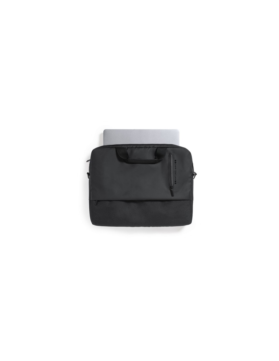 Maletín de Antonio Miró de calidad premium en resistente poliéster 600D. De sobrio diseño y con compartimento acolchado para portátil de hasta 15 pulgadas. Con cómoda asa de transporte reforzada, cierres de cremallera con tiradores metálicos y bolsillo frontal. Logotipo de la marca en frontal. Acolchado. Bolsillo Acolchado para Portátil Composition : Poliéster 600D.