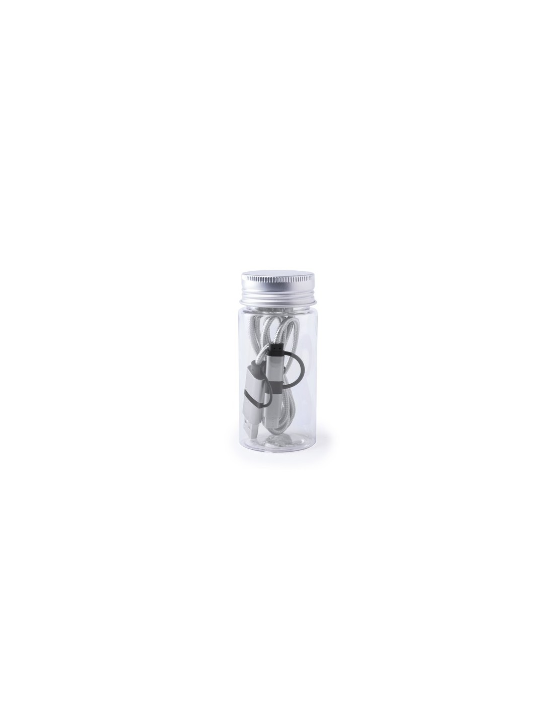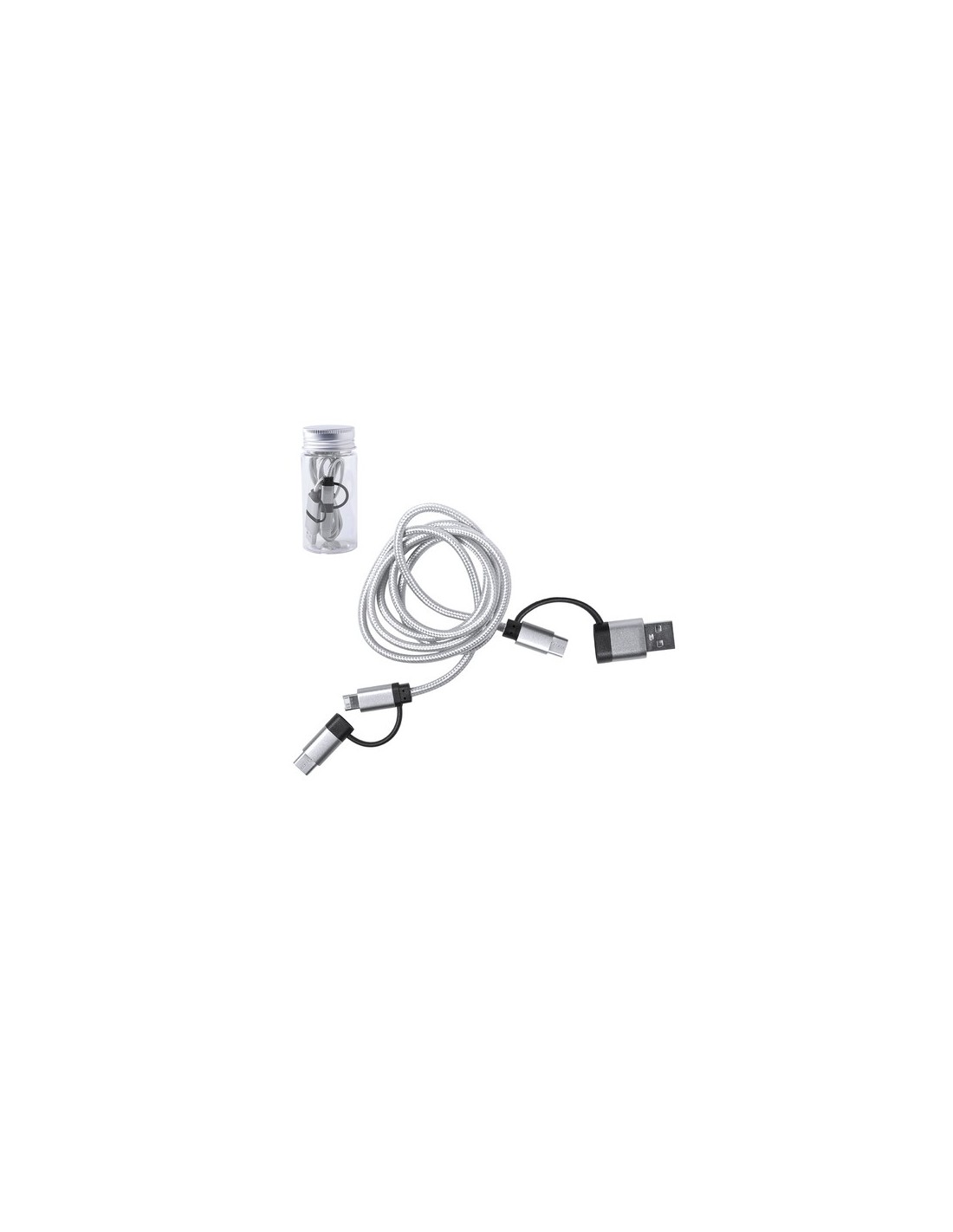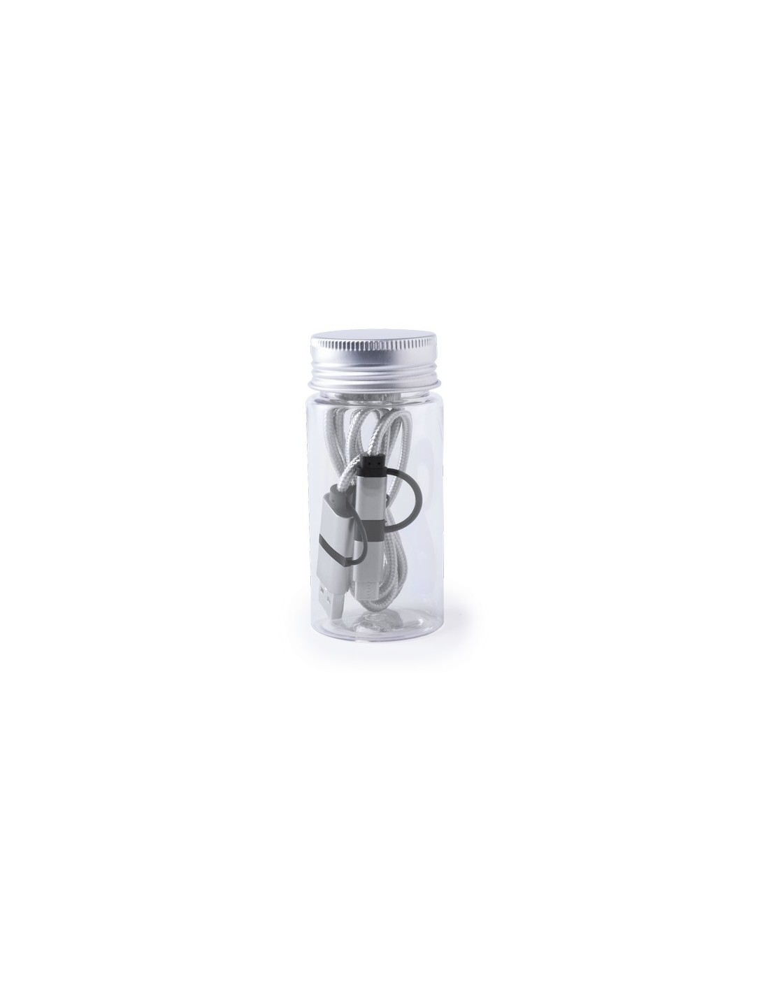 Cable cargador con conexión dual micro USB/Lightning y tipo C (entrada y salida). De 100cm de longitud, con conectores de aluminio y especialmente diseñado para marcaje en láser. Presentado en atractivo bote transparente con tapa a rosca. Conexión Micro USB, Tipo C y Lightning 5V DC 2.4A Composition : Aluminio.