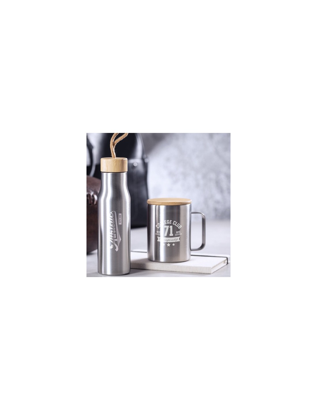 Taza de térmica de acero inox y 350ml de capacidad. Tapa fabricada en bambú y presentada en atractiva caja de diseño eco. 350 ml Composition : Acero Inox/ Bambú.