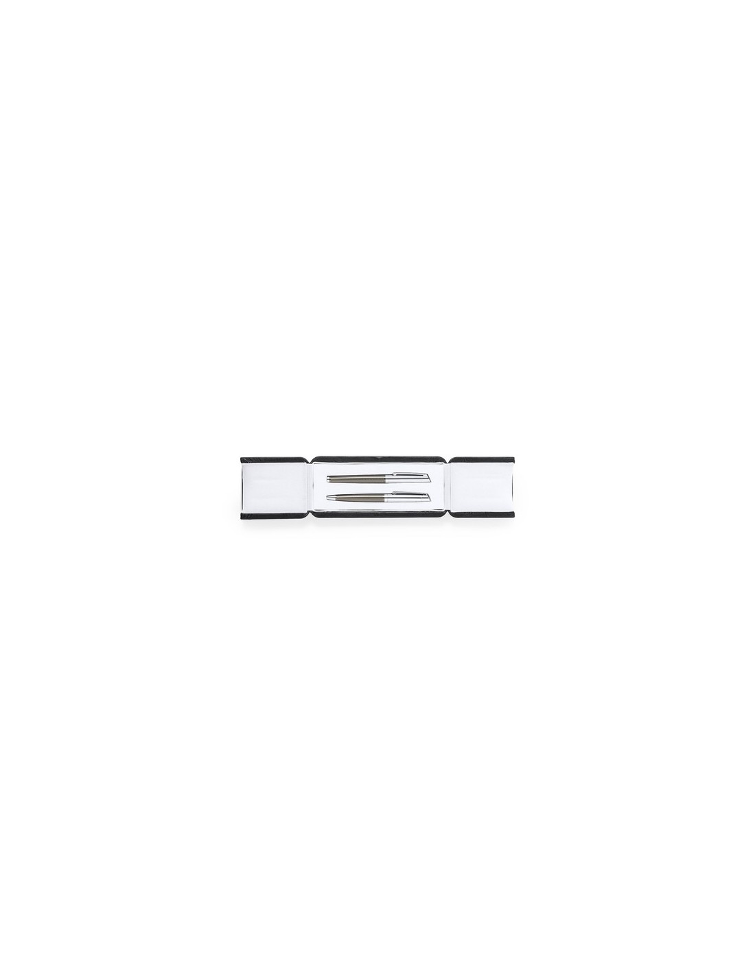 Set premium de bolígrafo y roller. Fabricado en elegante combinación de metal en tonos negros y cromados. Bolígrafo de mecanismo giratorio en tinta azul y con cartucho jumbo. Roller con capucha y tinta gel en azul, carga jumbo. Presentado en estuche individual de polipiel con interior en contraste de antelina en blanco. Bolígrafo y Roller. Carga Jumbo Composition : Metal.