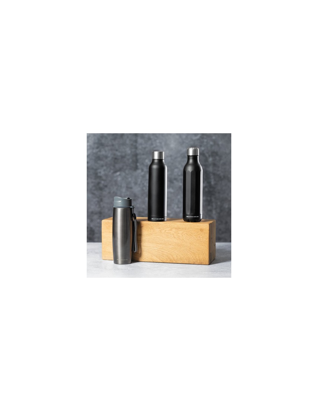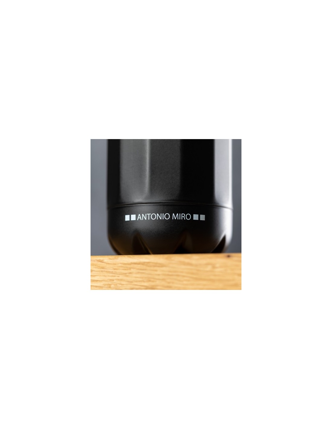 Bidón en acero inox de Antonio Miró. De 750ml de capacidad y sobrio acabado en negro satinado, con cuerpo prisma y logotipo de la marca en la base. Con tapón cromado a rosca y presentado en atractiva caja de diseño con logotipo de la marca. 750 ml Composition : Acero Inox.