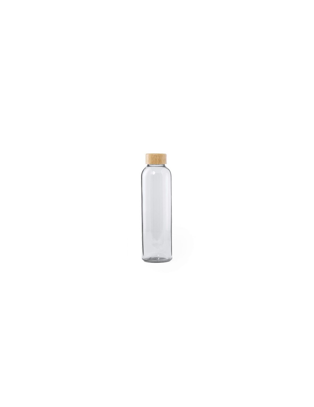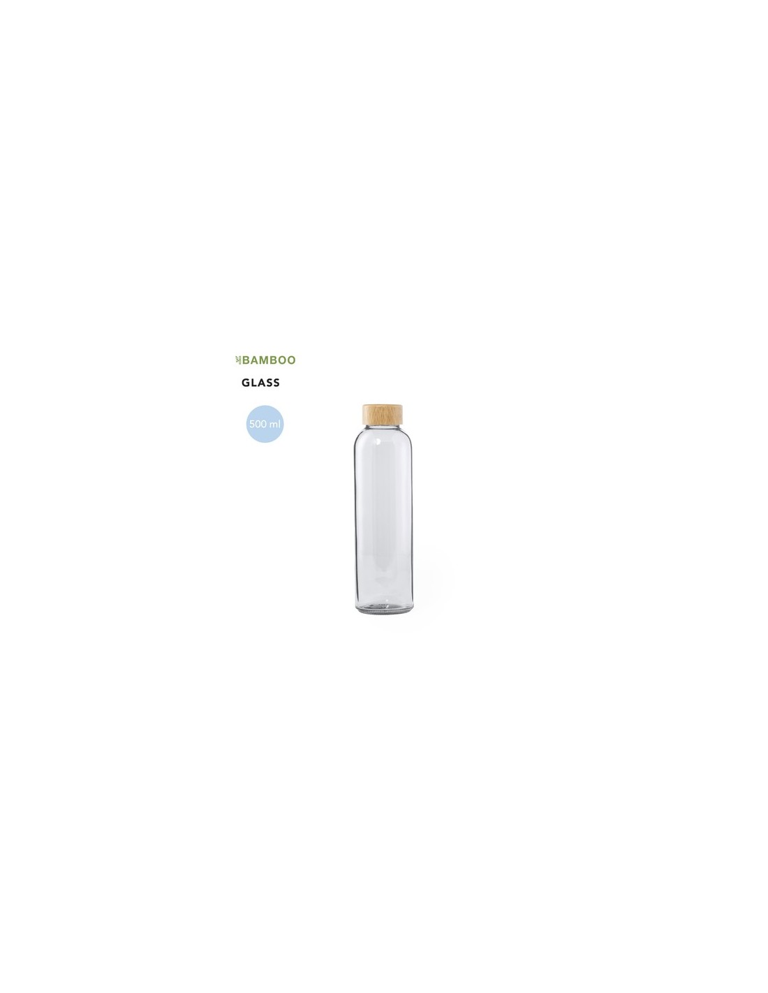 Bidón transparente de cristal de 500 ml de capacidad, con tapón a rosca en bambú y libre de BPA. Presentado en atractiva caja de diseño kraft. 500 ml. No apto para sublimación Composition : Cristal/ Bambú.