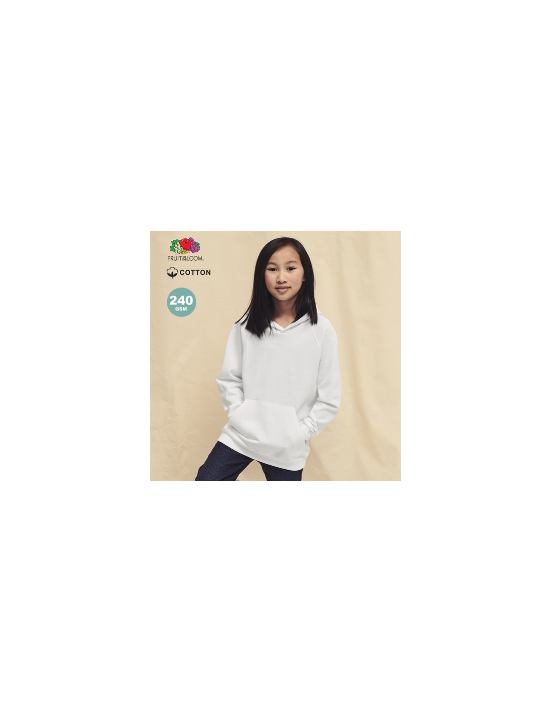 Sudadera unisex para niños Lightweight Hooded Sweat de Fruit Of The Loom. Fabricada en felpa sin cepillar, en combinación de materiales 80% algodón + 20% poliéster de 240g/m2. Capucha sin cordón de ajuste para garantizar la seguridad de los niños y en cumplimiento con la legislación europea de ropa infantil. Manga ranglán y bolsillo frontal tipo canguro, con cintura y puños en algodón/ LYCRA. Disponible en variada gama de colores y en tallas 5-6, 7-8, 9-11, 12-13, 14-15. Composition : 80% Algodón/ 20% Poliéster 240 g/ m2.