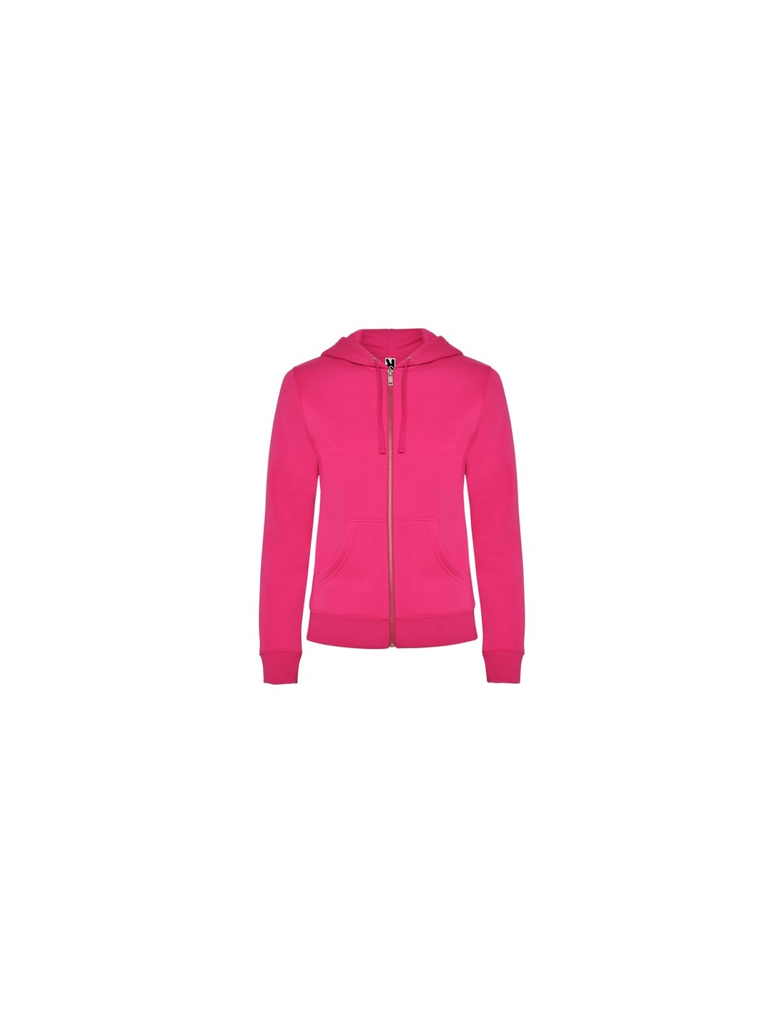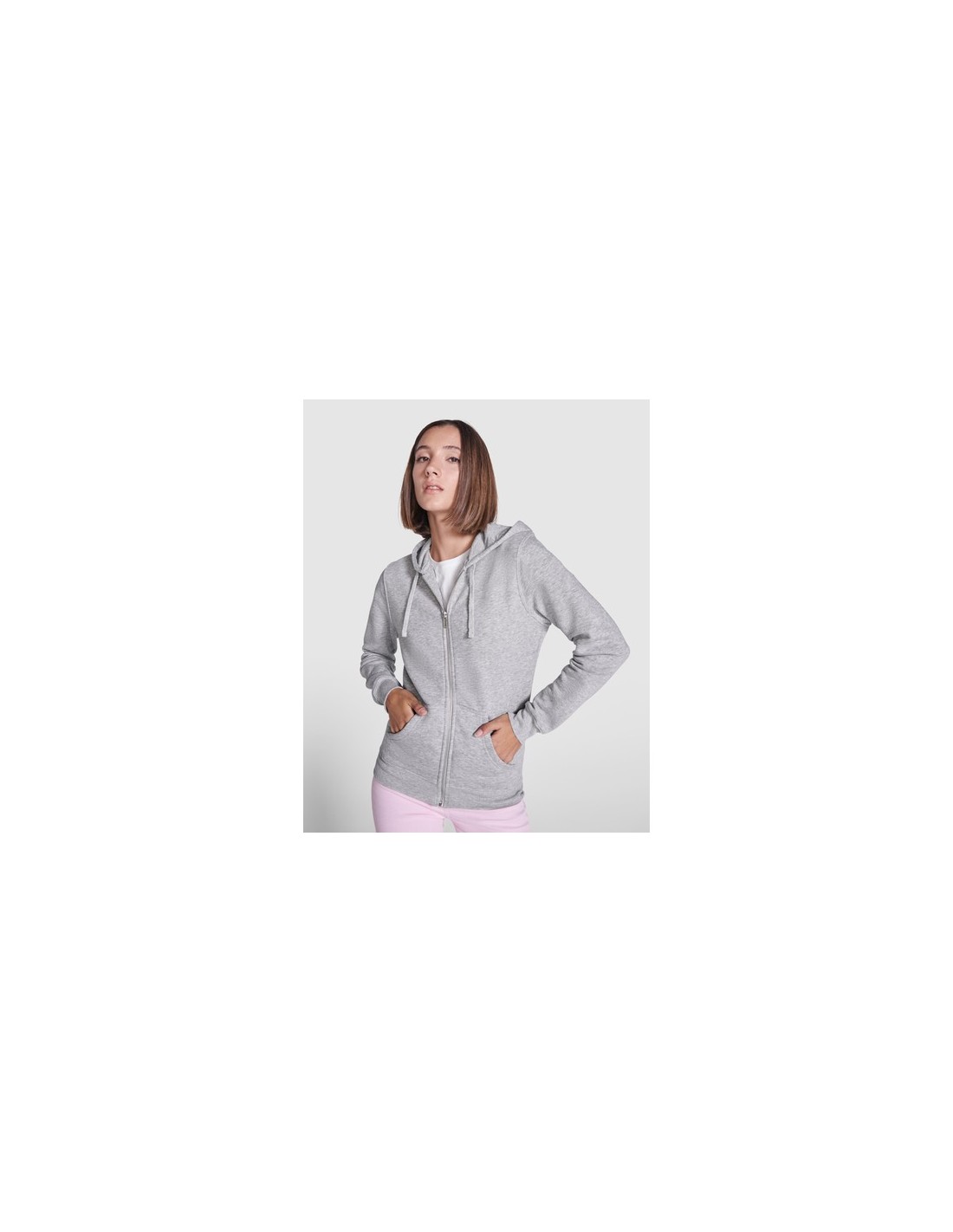Sudadera de mujer con capucha forrada a tono. Cremallera metálica frontal y bolsillo estilo canguro. Cubrecosturas reforzado en el cuello interior, corte entallado, y punto canalé 2x2 en puños y cintura. *Cremallera metálica en color plata.*Etiqueta removible. Composition : 50% algodón / 50% poliéster, felpa perchada, 280 g/m².Color gris vigoré 58: 55% algodón / 40% poliéster / 5% viscosa.