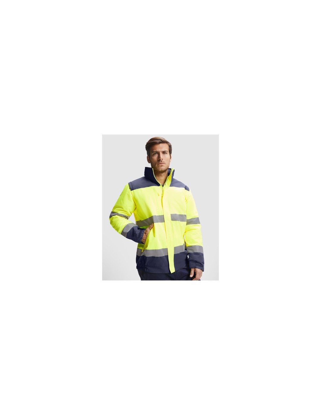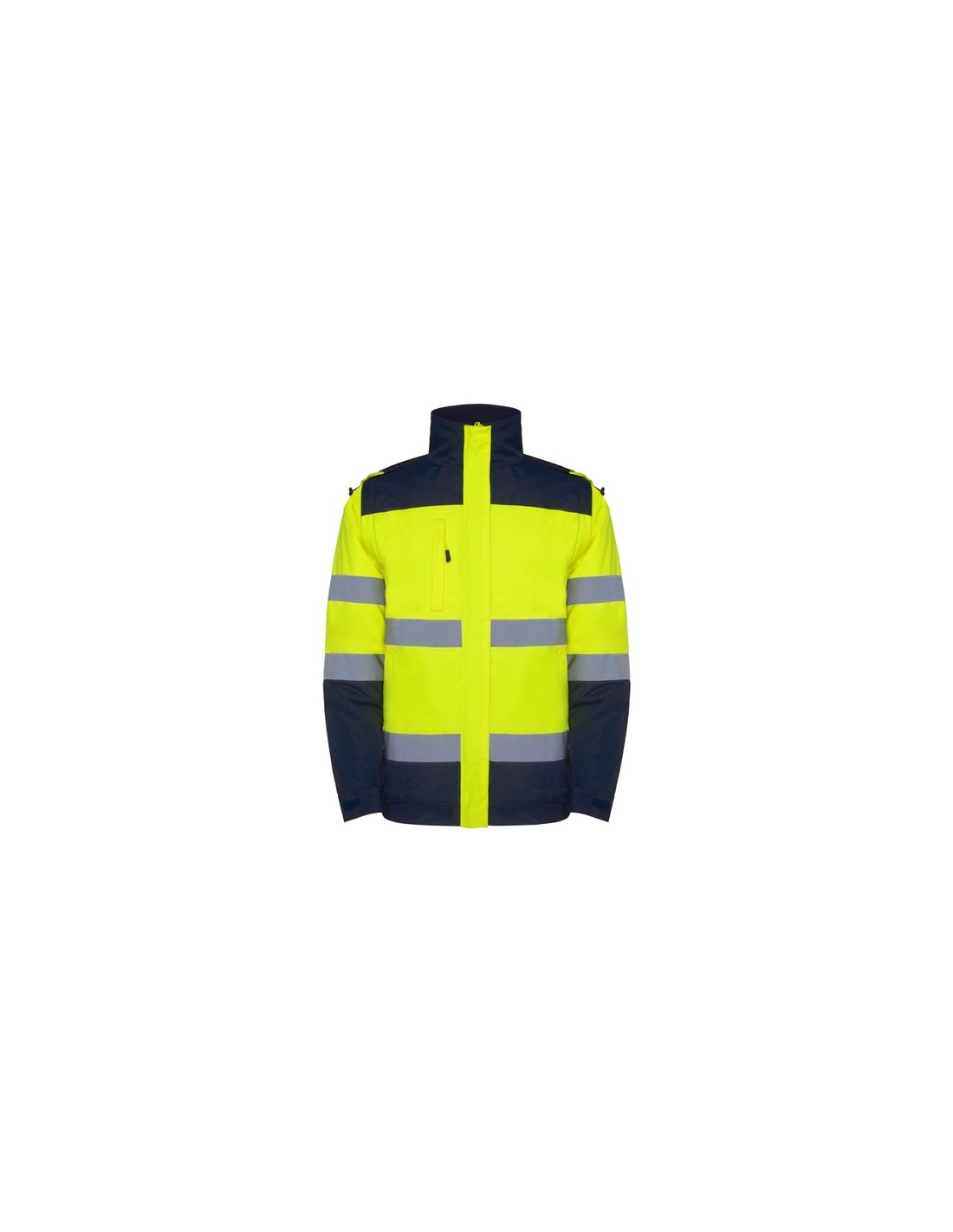 Parka acolchada de alta visibilidad combinada en dos colores. · Capucha enrollable con cordón ajustable y ribete flúor.· Bolsillo en la zona del pecho con cremallera.· Dos cintas reflectantes en el cuerpo y las mangas. · Mangas desmontables. · Dos bolsillos frontales ligeramente inclinados de fácil acceso. · Puños ajustables por zona elástica y por cierres en velcro.· Tapeta central con cierre de velcro y cremallera central flúor con tirador. · Acceso interior para serigrafía.· Bajo con zona elástica. *Alta visibilidad.*Modelo resistente al agua.*Modelo a prueba de viento.Certificación CE según las normas:EN ISO 13688:2013/A1:2021EN ISO 20471:2013/A1:2016.EN 343:2019.Clase II. Composition : Exterior: 100% waterproof poliéster. Forro: 100% poliéster.Guata: 100% poliéster.400 g/m².