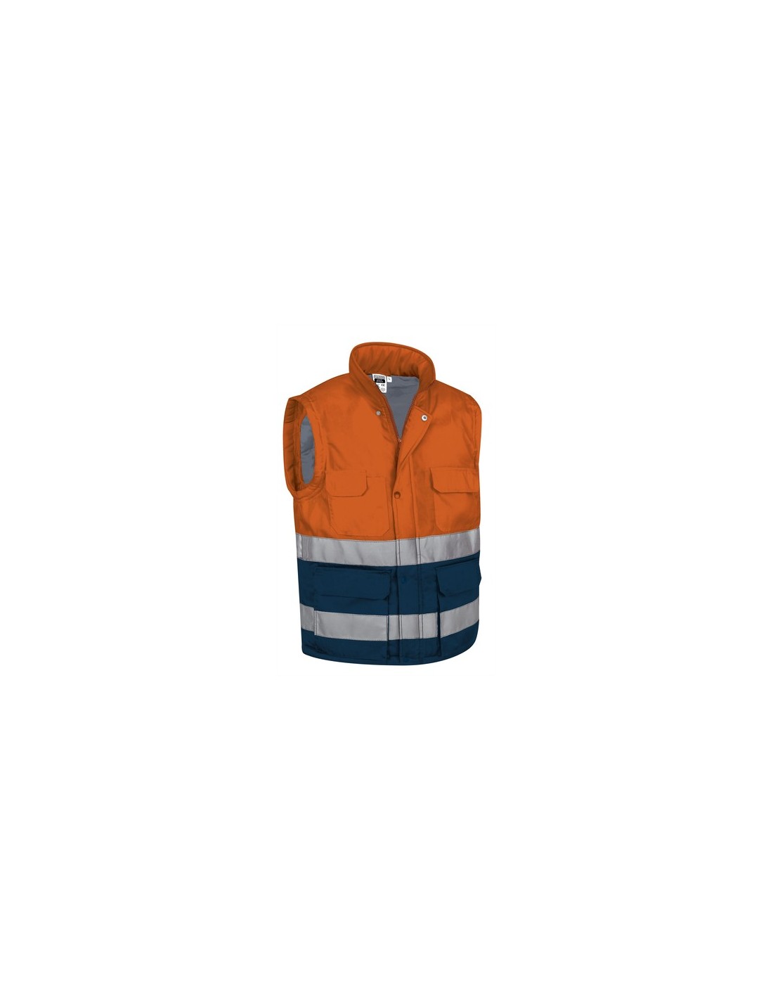 Chaleco acolchado multibolsillos bicolor de Alta Visibilidad.Confeccionado en tejido sarga resistente y duradero exterior, forro interior liso y relleno acolchado que aporta retención térmica, incluye dos cintas retro-reflectantes cosidas en torso y espalda para mayor seguridad.Prenda certificada como EPI de Categoría II de Alta Visibilidad en base a las normas 13688 y 20471, clase 1, con duración máxima de 25 lavados.Cuello alto con cierre de cremallera, tapeta y corchetes a presión, cortavientos elástico en sisas, cintura regulable con cierres laterales de botones a presión para un mejor ajuste, faldón trasero que cubre la zona lumbar.Dos bolsillos frontales con fuelle, dos en el pecho, todos con tapeta, dos laterales y uno interior para tener todo accesible y resaltar el marcaje, incluye departamentos para bolígrafo.Incluye cremallera interior trasera para facilitar los diferentes tipos de marcaje: serigrafía, transfer, vinilo, bordados, cosidos.Ideal como ropa laboral y uniformes de trabajo. Composición : exterior: 65% poliester 35% algodon - interior: 100% poliester
