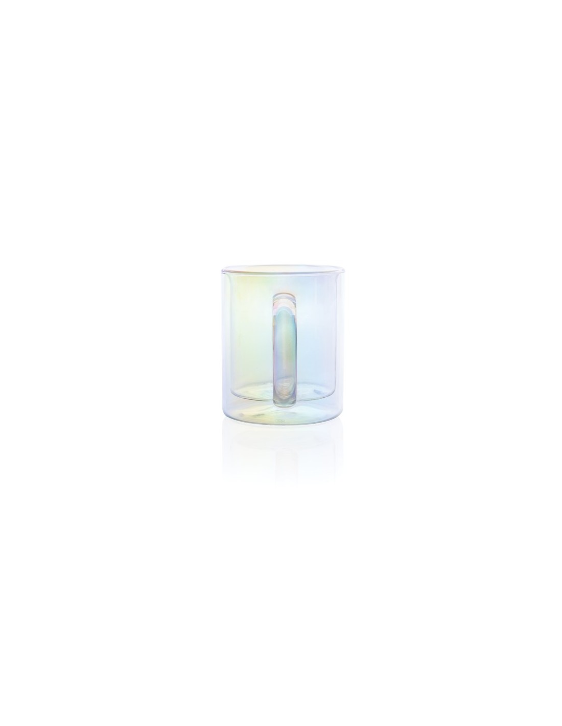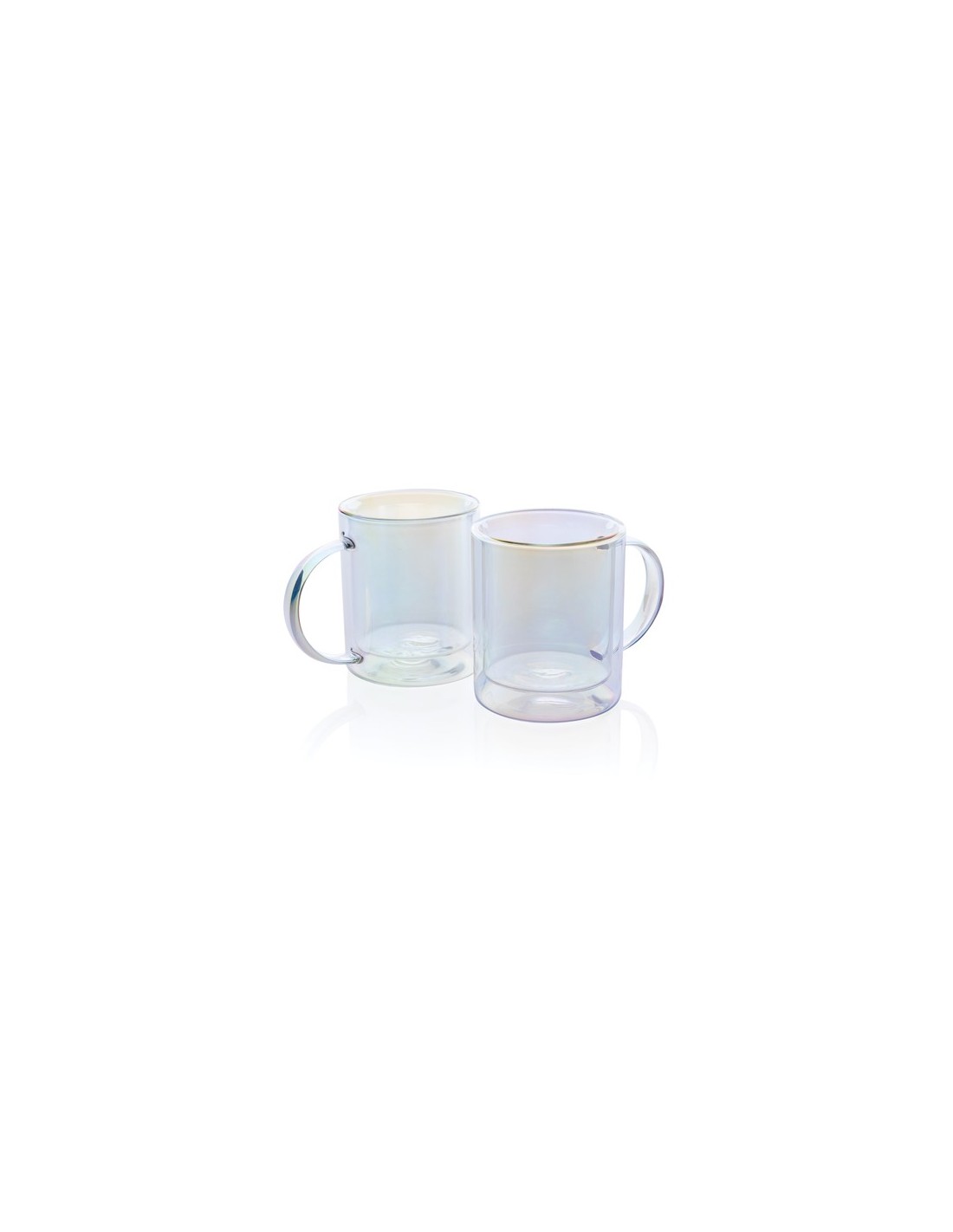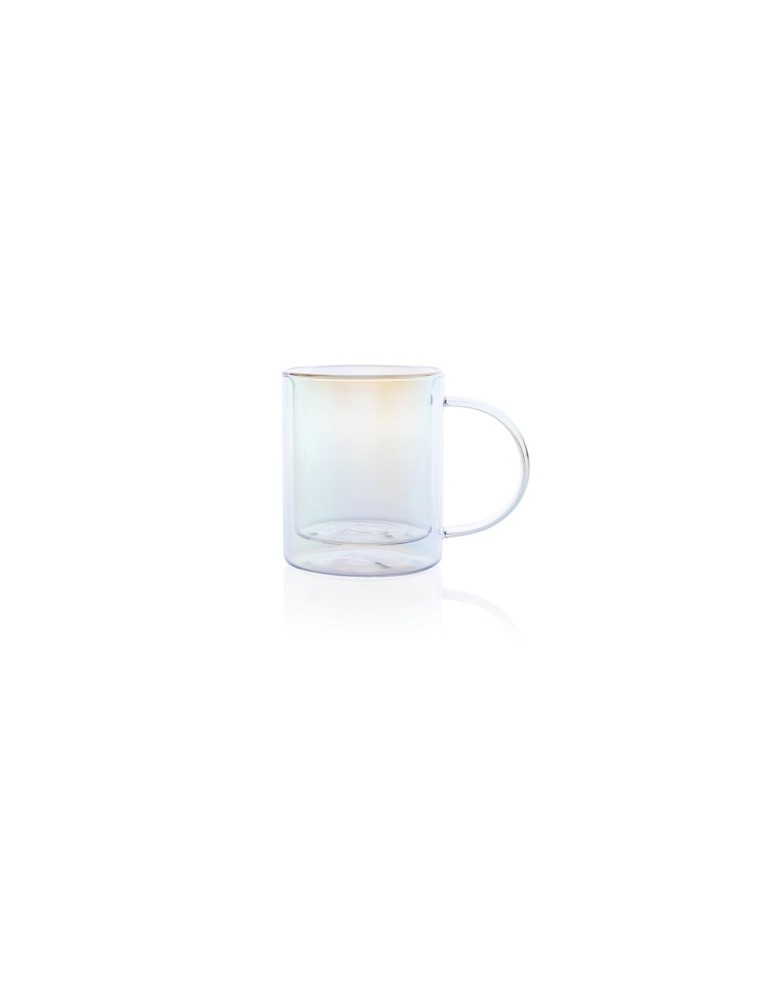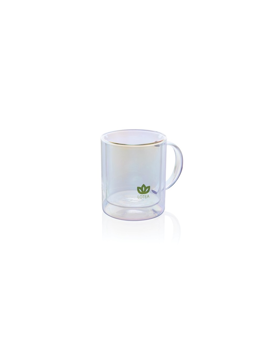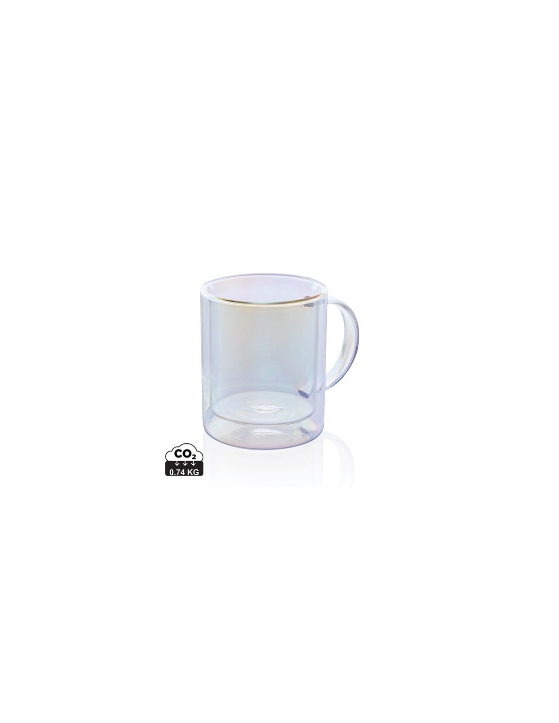 Fabricado con vidrio de doble pared liviano pero duradero que está listo para el frío y el calor. Fabricado con vidrio de borosilicato de alta calidad. Acabado galvanizado para un efecto extra chic. Vienen en caja a todo color. Capacidad 330ml. Material : Vidrio Recycled Content Percent : 0 Sin materiales Bisphenol A, Conforme legislación alimentos Alemania, Conforme directiva Phtalate content, Libre de parafinas cloradas de cadena corta y media. Packaging : Caja de regalo All print codes : SilkScreen Round,Pad Print Drinkware - Print code default : Serigrafía 360 - artículo - 180 x 60 mm - max color : 1 Social Audits : BSCI Total CO2 emissions : 0,74.