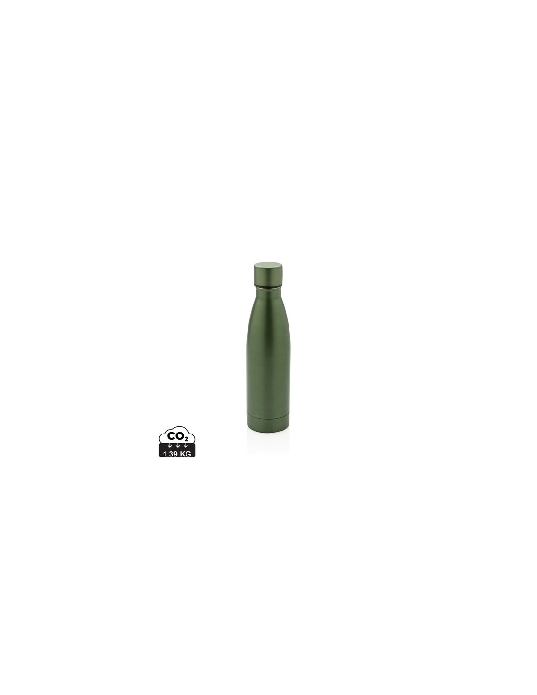 Esta botella al vacío de acero inoxidable reciclado RCS está diseñada para disfrutar de tus bebidas durante mucho tiempo! La construcción al vacío de acero inoxidable reciclado de doble pared mantiene las bebidas frías durante 15 horas o calientes durante 5 horas. Esta botella se adapta a la mayoría de los portavasos estándar para automóviles, por lo que puedes llevarlas a cualquier parte. Fabricado con materiales reciclados certificados RCS (Recycled Claim Standard). La certificación RCS garantiza una cadena de suministro completamente certificada de los materiales reciclados. Contenido reciclado total: 93% basado en el peso total del artículo. Sin BPA. Capacidad 500ml. Incluye embalaje kraft certificado FSC®. Material : Acero inoxidable reciclado, Acero inoxidable reciclado Recycled Content Percent : 85 Conforme legislación alimentos Alemania, Conforme PAHS content in Reach & ZEK 01-4-08, Conforme directiva Phtalate content, Libre de parafinas cloradas de cadena corta y media. Packaging : Caja de regalo All print codes : Pad Print Drinkware,Doming,Laser Engraving 3,Laser Round 360,Digital round 360-2,SilkScreen Round - Print code default : Tampografía - parte frontal del artículo - 25 x 70 mm - max color : 5 Social Audits : BSCI Total CO2 emissions : 1,39.