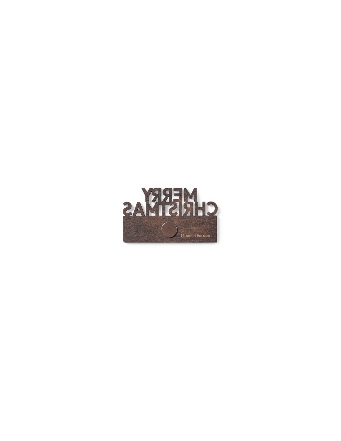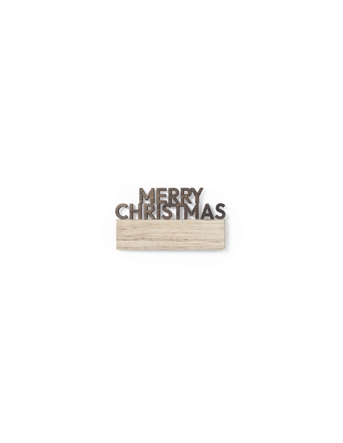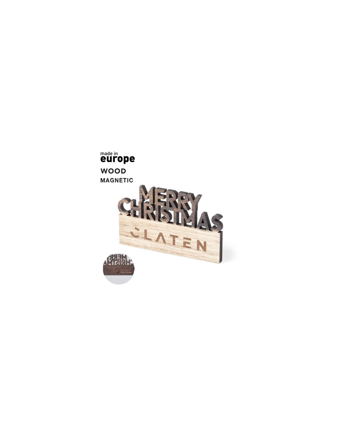 Original imán Merry Christmas fabricado en madera natural, con texto troquelado y de original acabado bicolor. Amplia superficie de marcaje y distintivo Made In Europe. Composition : Madera.