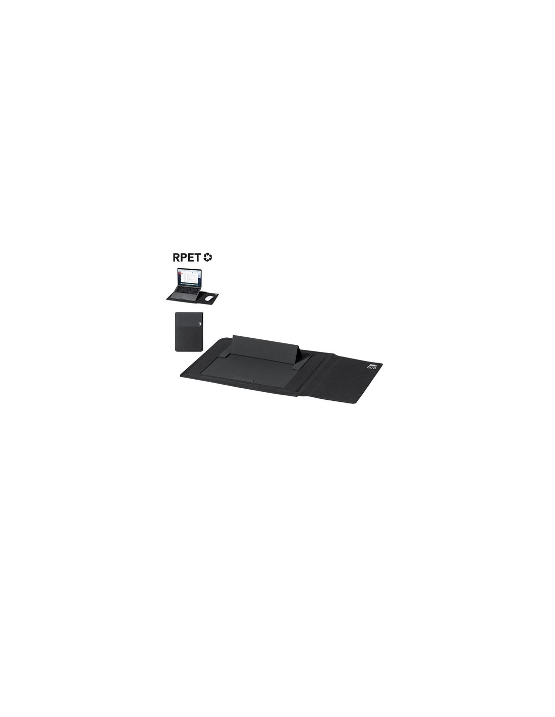 Funda de ordenador fabricada en poliéster 600D RPET, elaborado a partir de plástico reciclado, para así fomentar la reutilización de residuos plásticos y ayudar a la sostenibilidad del planeta. Con cierre magnético y distintivo RPET. Interior desplegable con alfombrilla para ratón y soporte inclinado para ordenador. Presentado en caja individual de diseño. Composition : Poliéster 600D RPET.