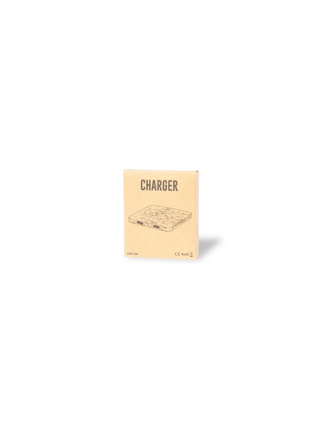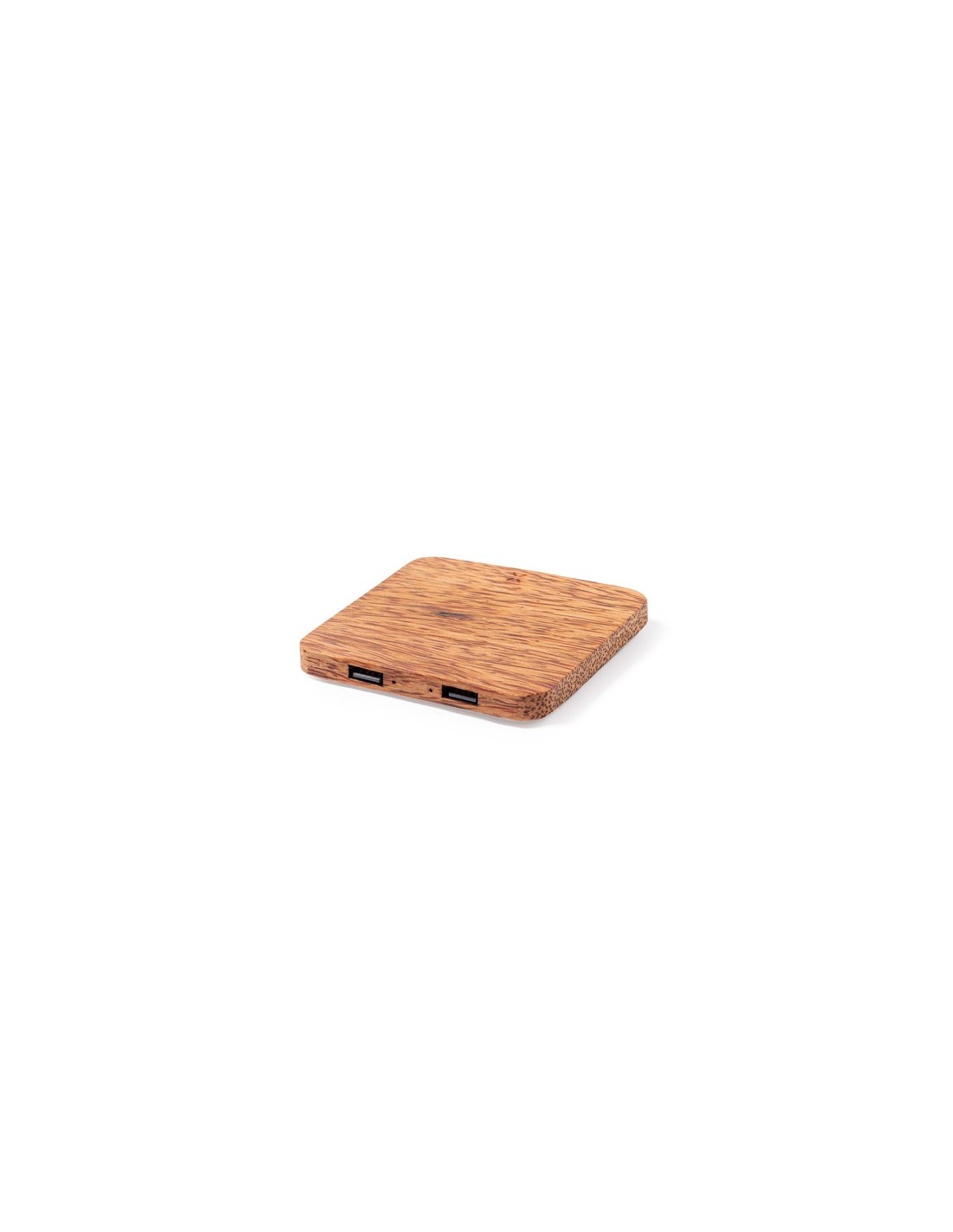 Cargador inalámbrico 10W de línea nature fabricado en coco. Tras el consumo de su fruto, del coco y su planta se pueden obtener multitud de productos, contribuyendo a la sostenibilidad del planeta y fomentando el uso de materias primas naturales. Incluye 2 salidas USB de 2100mA y es compatible con dispositivos equipados con tecnología de carga inalámbrica. Amplia superficie de marcaje y presentado en caja individual de diseño eco en cartón kraft. Inalámbrico 10W. 2 Salidas USB Composition : Coco.