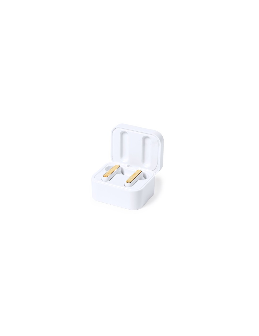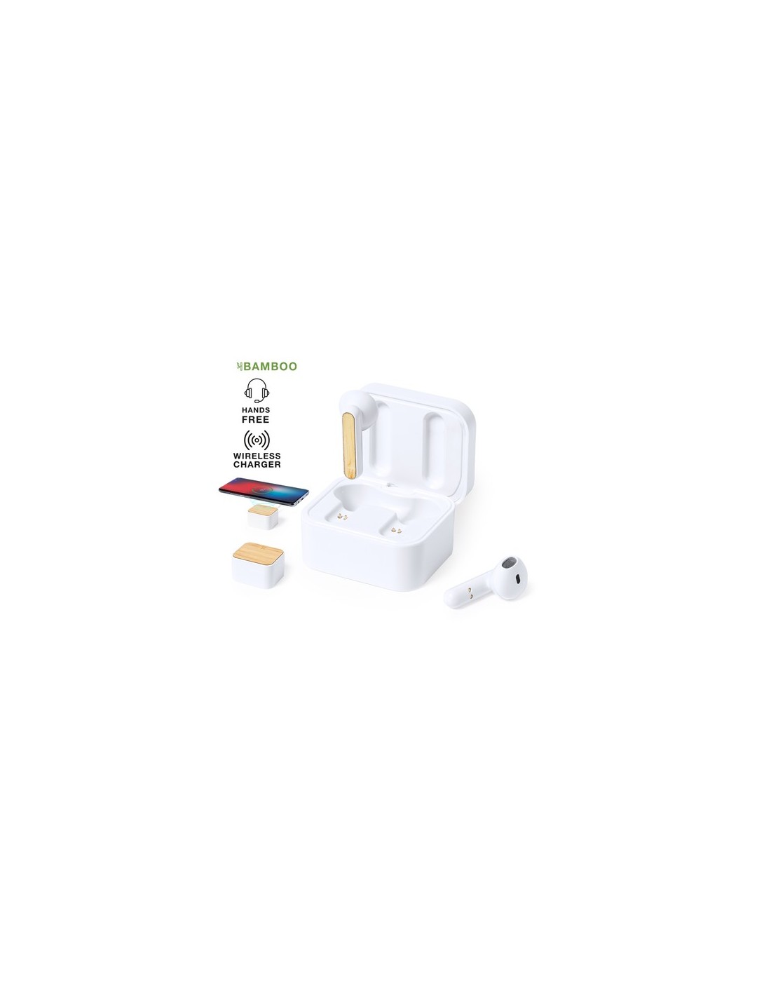 Auriculares intraurales de línea nature. Fabricados en resistente ABS con detalles en bambú en auriculares y base. Conexión Bluetooth 5.0 y función manos libres, con botón de control táctil en el auricular. Incluye cargador inalámbrico 10W integrado en la tapa de bambú de la base de caga. Recargables por USB, con cable Tipo C incluido. Presentados en caja individual de diseño eco en cartón kraft. Inalámbrico 10W. Conexión Bluetooth. Batería 30 mAh/ Base Carga 300 mAh Composition : Bambú/ ABS.