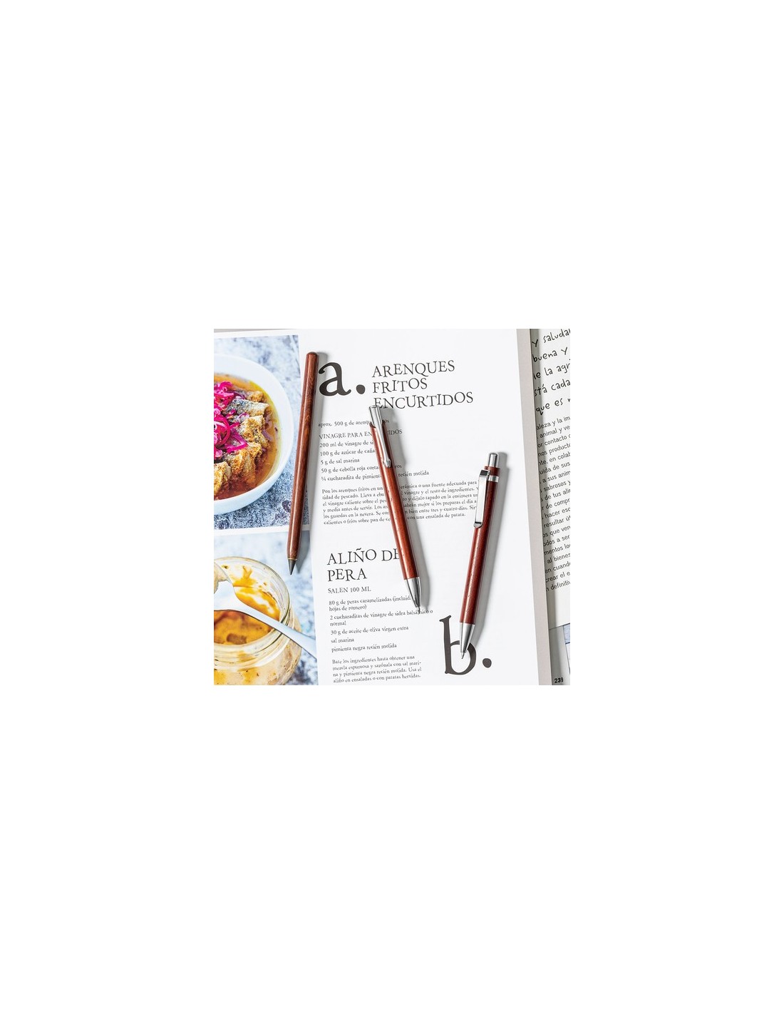 Bolígrafo de línea nature, con cuerpo fabricado madera natural. De mecanismo pulsador y accesorios en cromado, con amplio clip metálico para grabado en láser. De cartucho jumbo y en tinta azul. Carga Jumbo Composition : Madera.