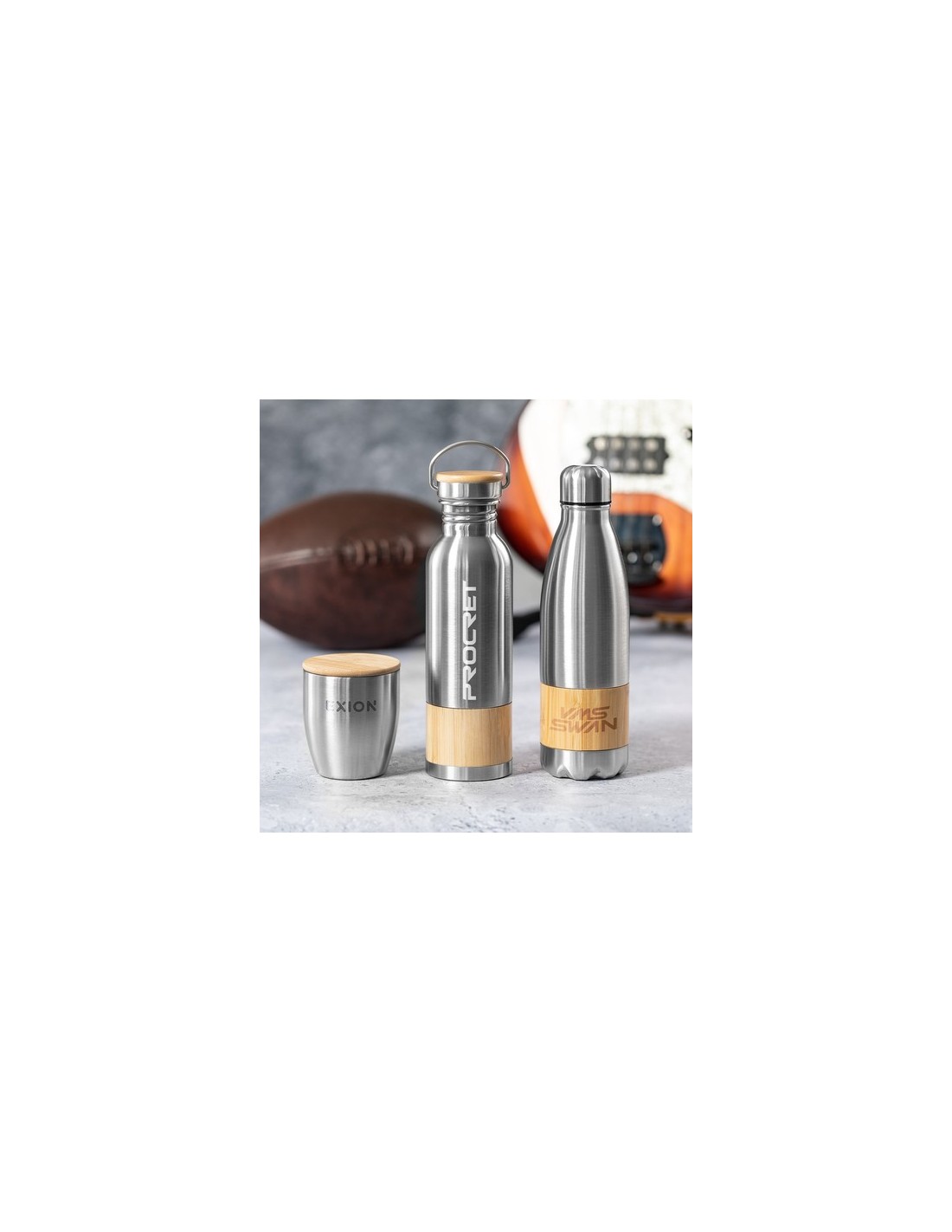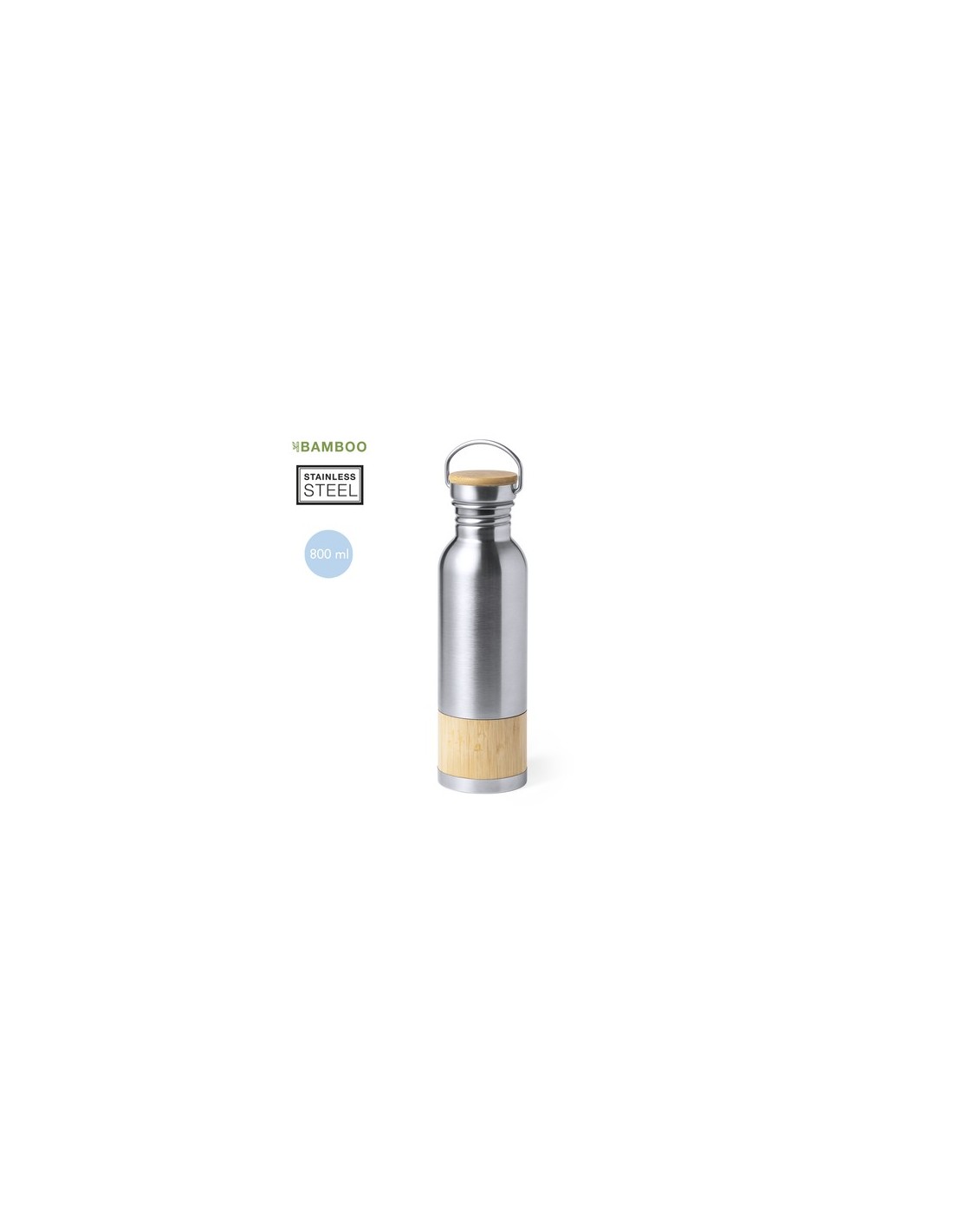 Bidón de original estilo retro y 800 ml de capacidad. Cuerpo en acero inox con franja de bambú, con tapón de seguridad a rosca en acero inox y detalle en bambú. Presentado en caja individual de diseño eco en cartón kraft. 800 ml Composition : Acero Inox/ Bambú.