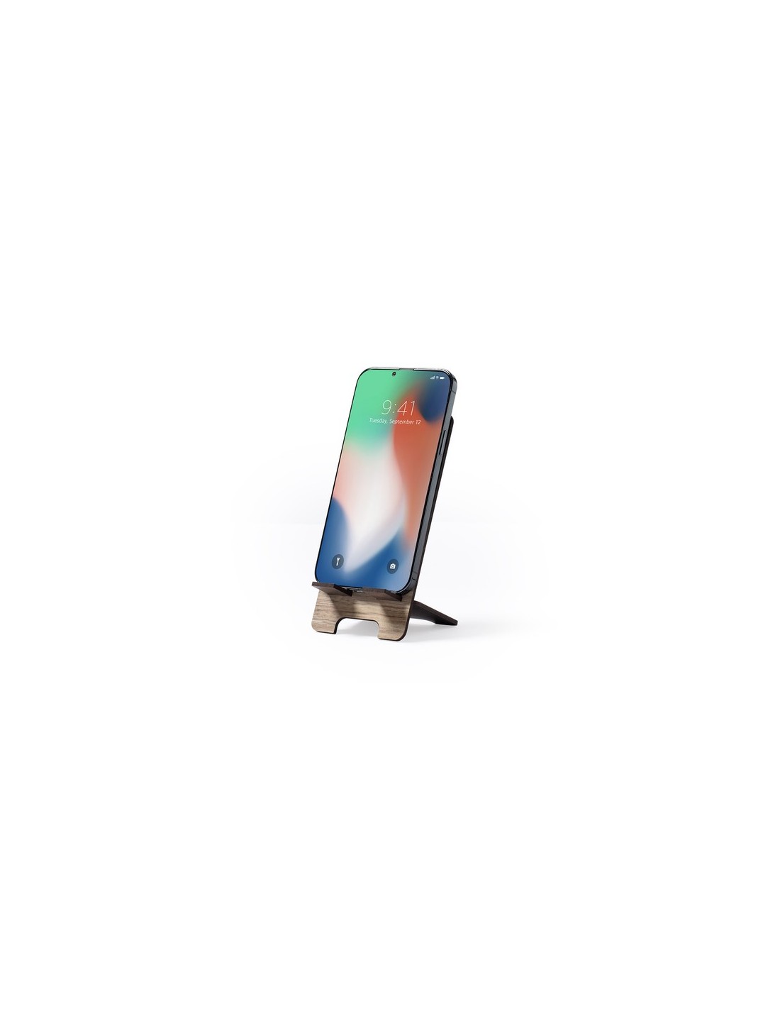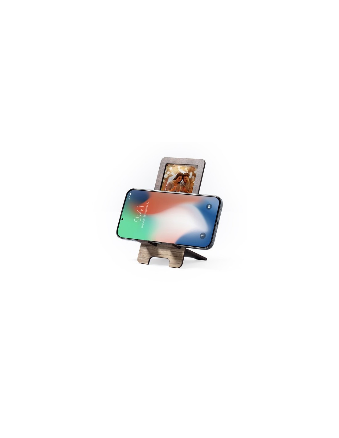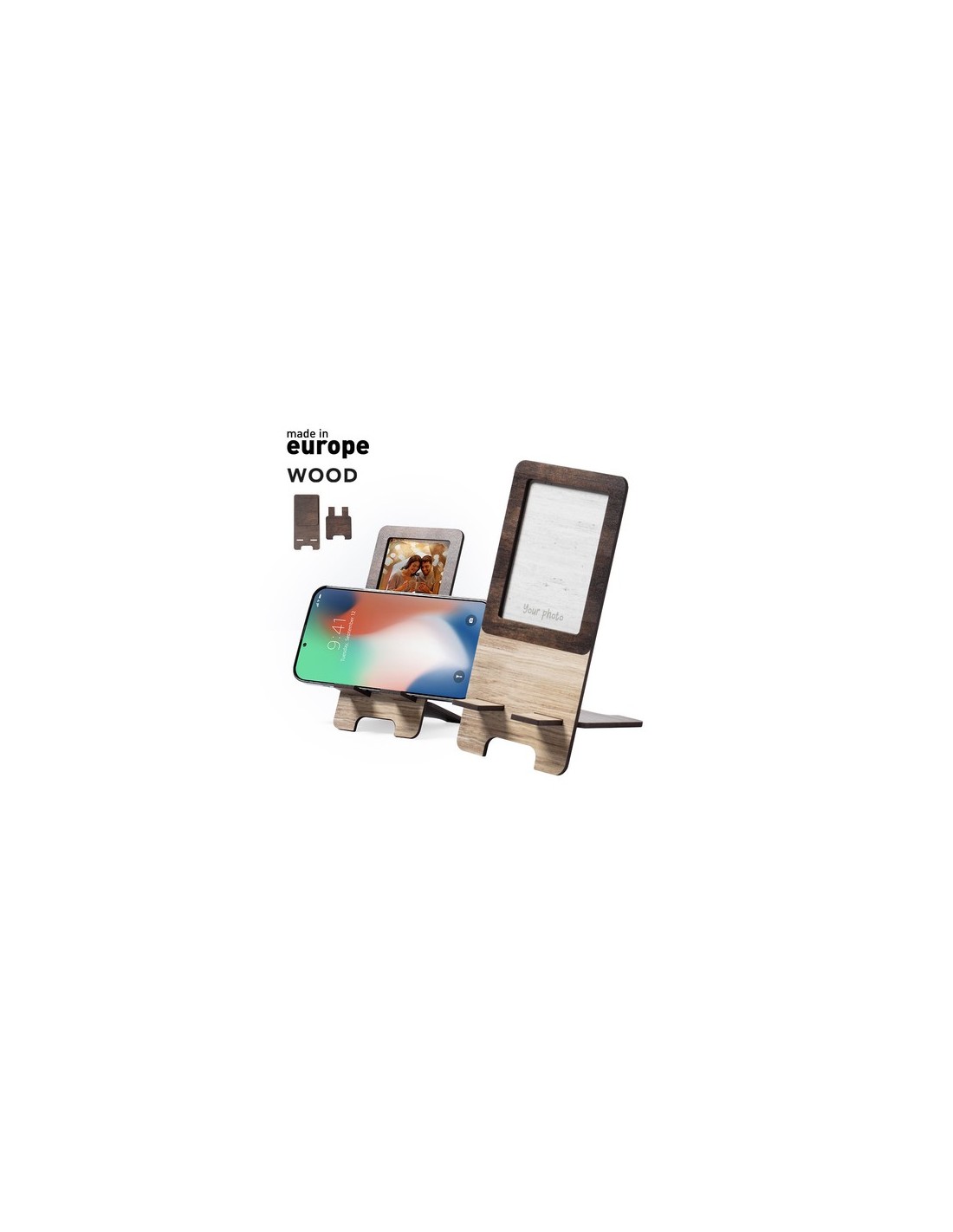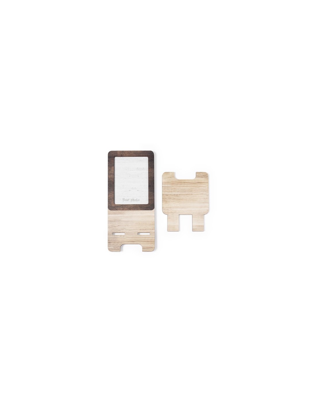 Soporte para smartphone con portafotos integrado. Fabricado en madera natural, con original acabado bicolor. Amplia superficie de marcaje, de fácil montaje y con distintivo Made In Europe. Fotos: 5,5 x 7,7 cm Composition : Madera.