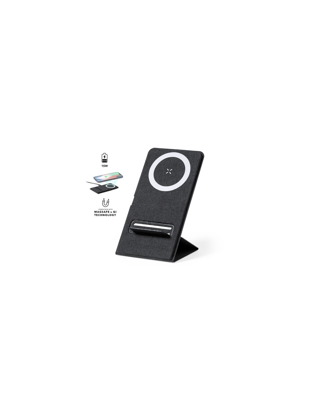 Cargador inalámbrico 15W. Fabricado en resistente poliéster 300D y con fijación magnética para poder usar el dispositivo mientras se produce la carga del mismo e incluyendo anillo adhesivo. Válido para todos los dispositivos con tecnología Magsafe y Qi. Plegado de pequeño tamaño para fácil transporte y presentado en atractiva caja individual de diseño. Inalámbrico 15W. Magnético. Plegable Composition : Poliéster 300D.