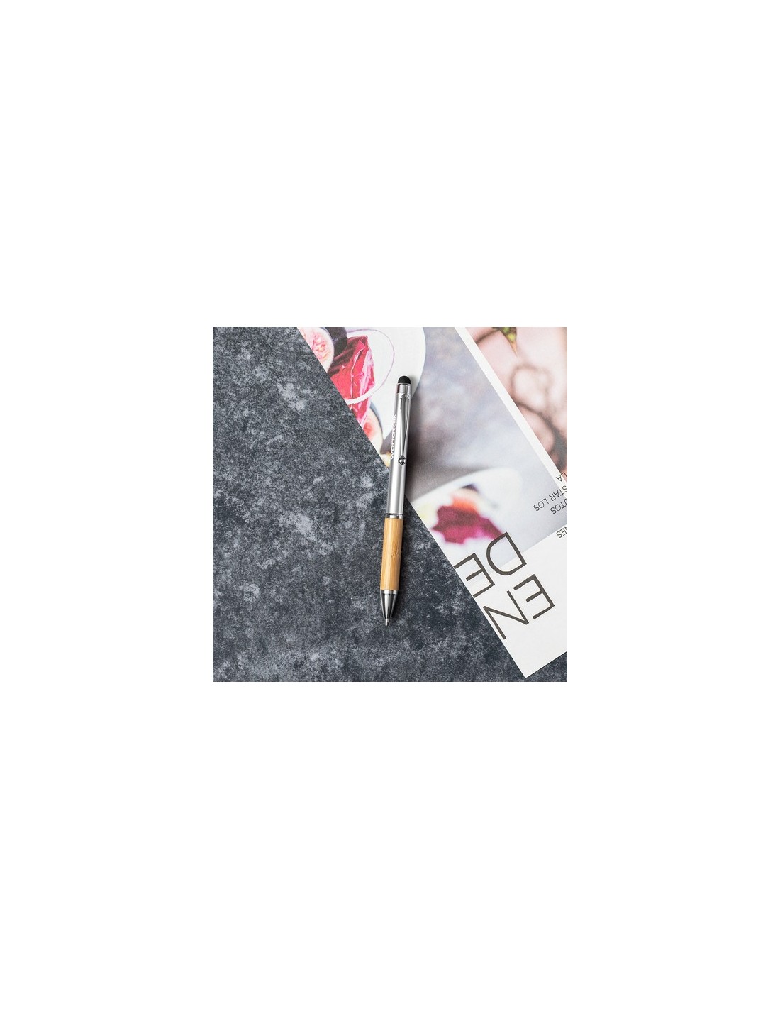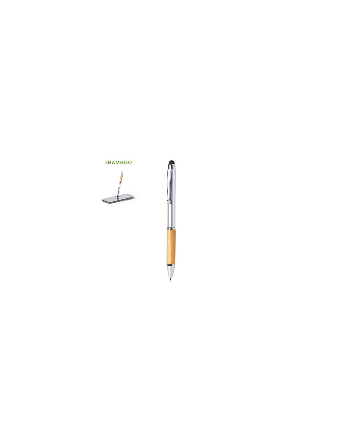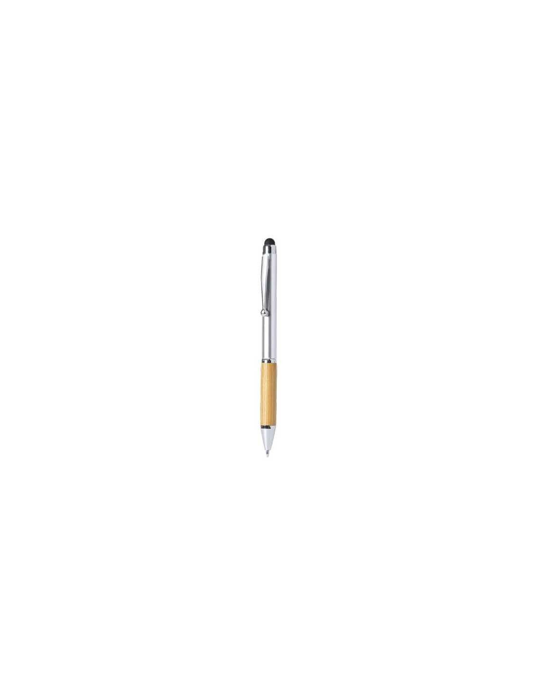 Elegante bolígrafo puntero de línea nature y mecanismo giratorio. Cuerpo en resistente ABS de acabado brillo y empuñadura en bambú, con accesorios a juego. Clip metálico y en tinta azul. Composition : ABS/ Bambú.