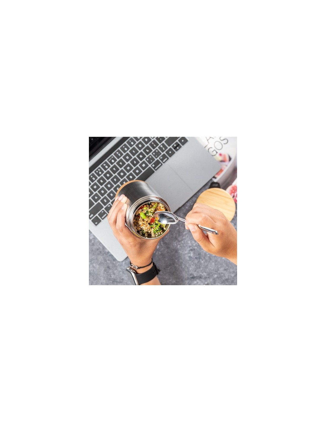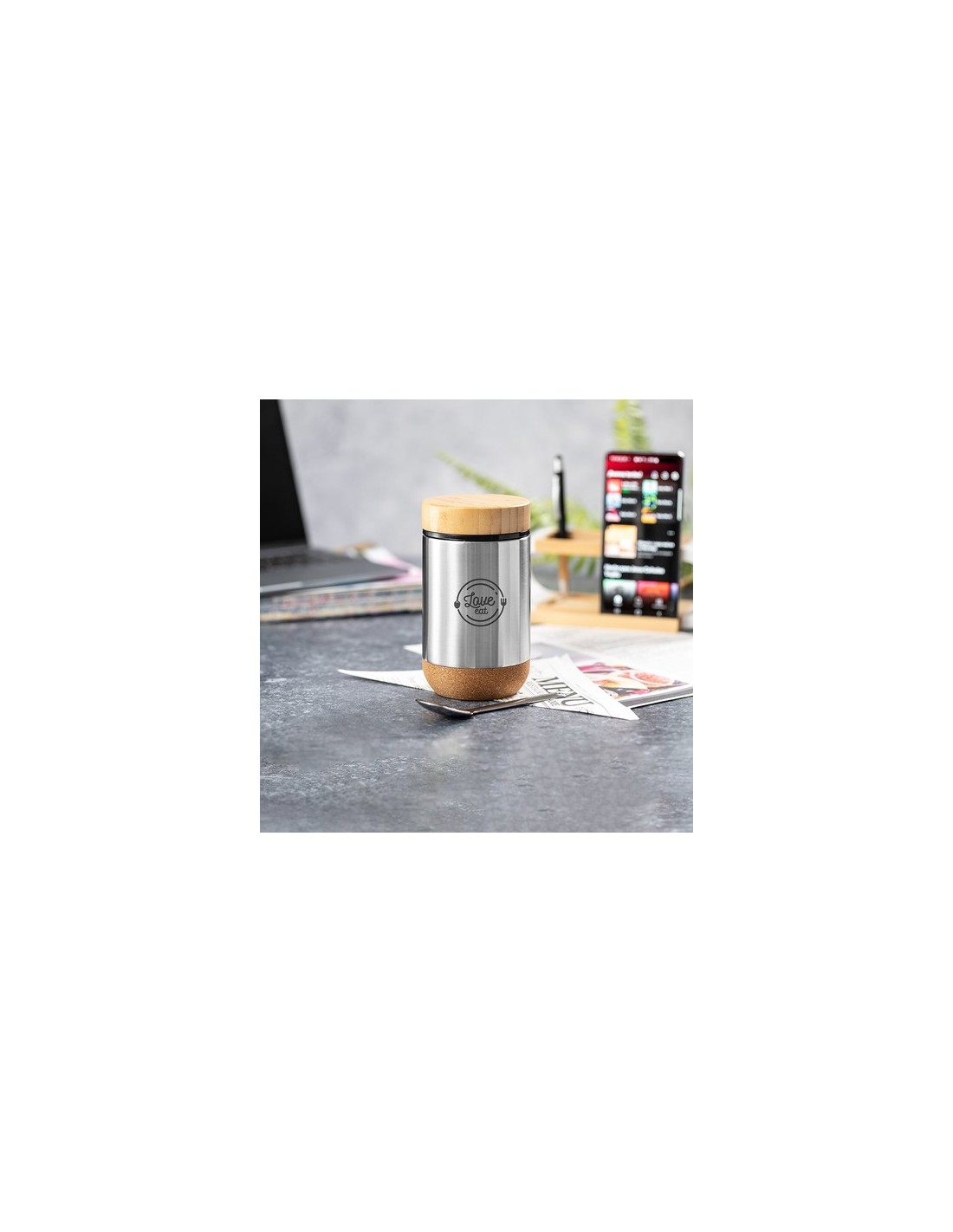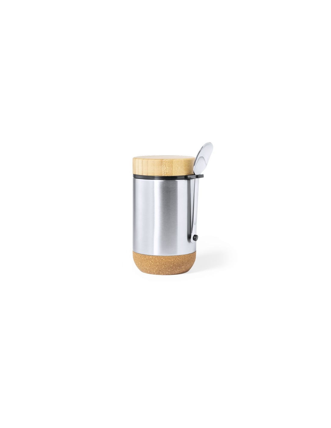 Fiambrera de línea nature y 450 ml de capacidad. Cuerpo en acero inox, con base de corcho para mantener la temperatura y tapón de seguridad en bambú, con accesorio de fijación para la cuchara de acero inox (incluida). Presentada en caja individual de diseño eco en cartón kraft. 450 ml Composition : Acero Inox/ Bambú/ Corcho.