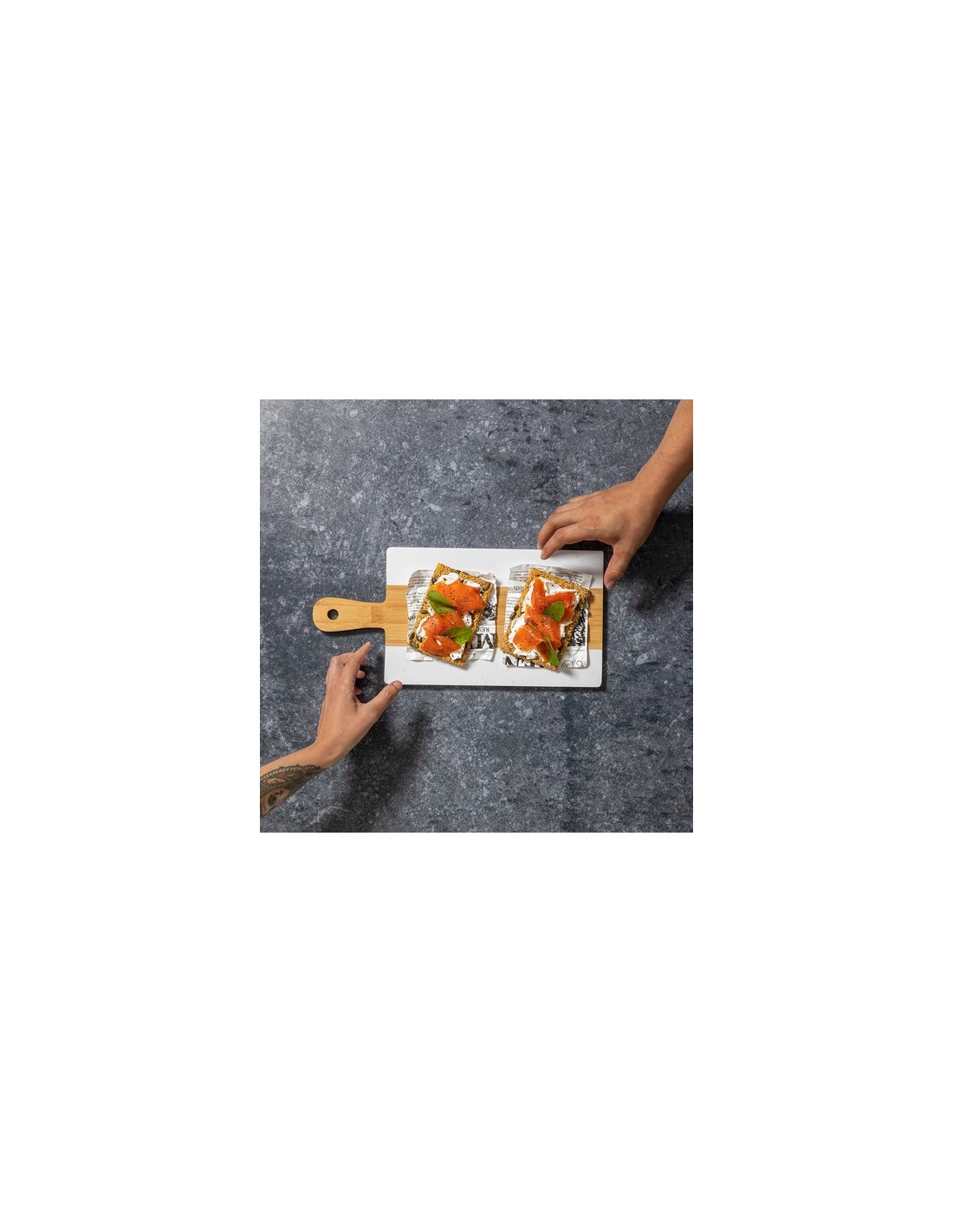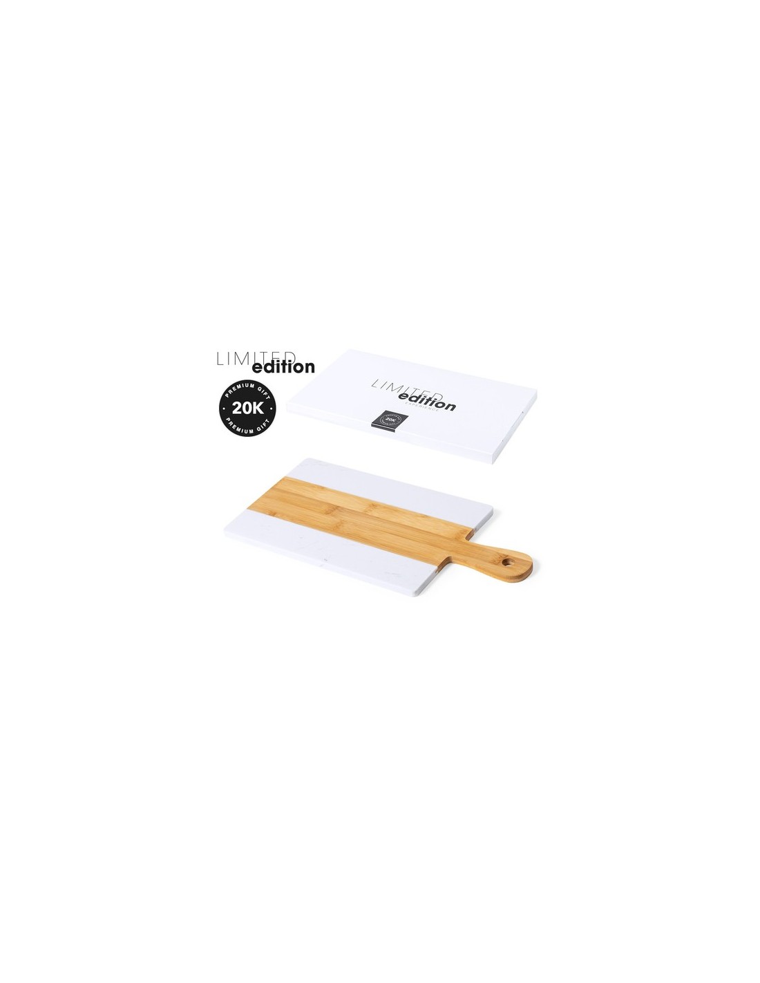 Tabla de corte y presentación Limited Edition. Un nuevo estilo que combina lo moderno y tradicional. Fabricada a partir de materiales naturales como el bambú y extracto de mármol. De suave y resistente acabado pulido y asa para fácil manejo. De la perfecta combinación entre exclusividad y diseño, nace Limited Edition, una colección especial de ideas promocionales de edidición limitada. Un nuevo concepto, inspirado en la fusión de artículos premium con las últimas y más novedosas tendencias y que cuenta con una seleción limitada de unidades, convirtiendo así un regalo en una experiencia única e inolvidable. Exclusivo estuche de presentación Limited Edition, con diseño protegido por derechos de propiedad industrial. Incluida tarjeta con descripción de Limited Edition en cartón reciclado. Composition : Bambú/ Extracto de Mármol.