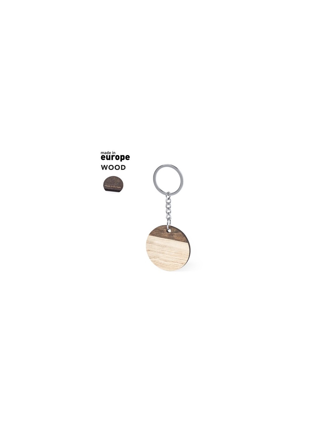 Llavero redondo, fabricado en madera natural y de original acabado bicolor. Amplia superficie de marcaje, con anilla y cadena metálicas y distintivo Made In Europe. Composition : Madera.