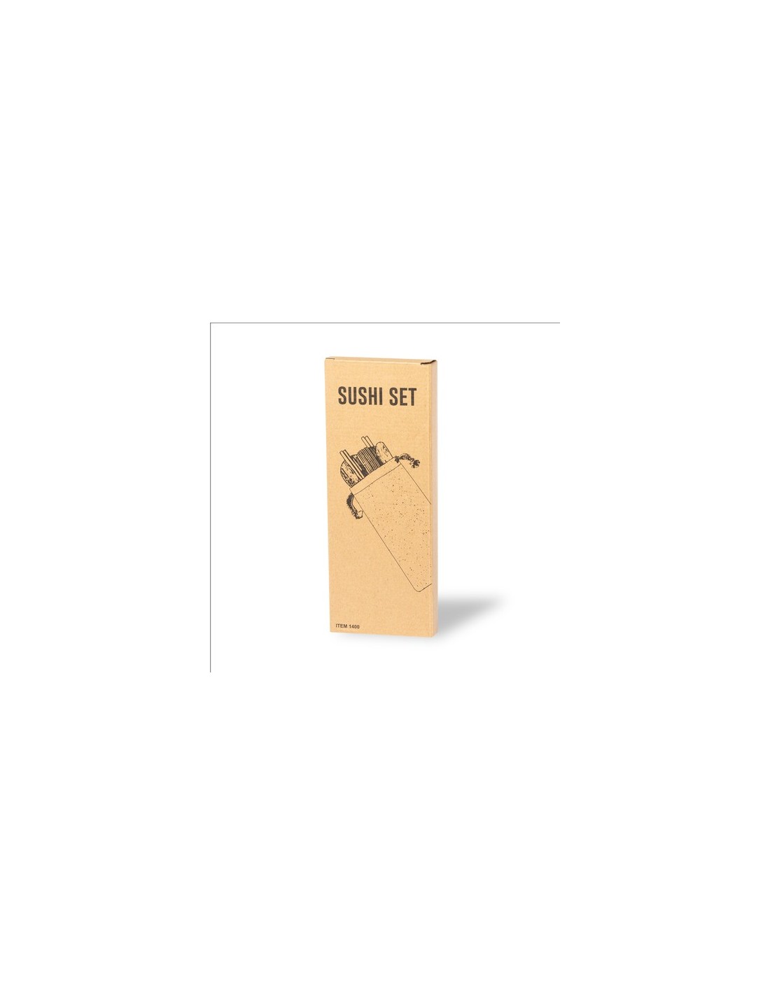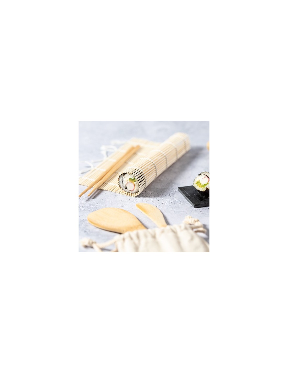 Set de sushi de 5 piezas fabricado en bambú natural. Compuesto por una estera de sushi, 2 juegos de palillos, una cuchara y cuchillo/paleta para el arroz. Incluye bolsa de algodón para fácil transporte y almacenaje. Presentado en caja individual de diseño eco en cartón kraft. 5 Piezas. Funda Algodón Composition : Bambú.