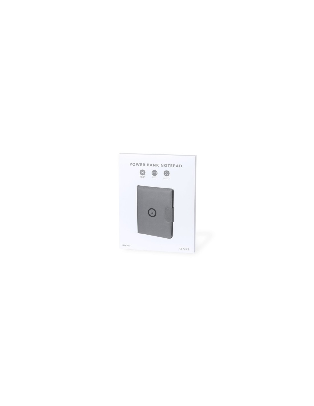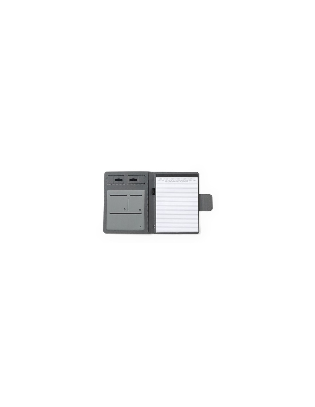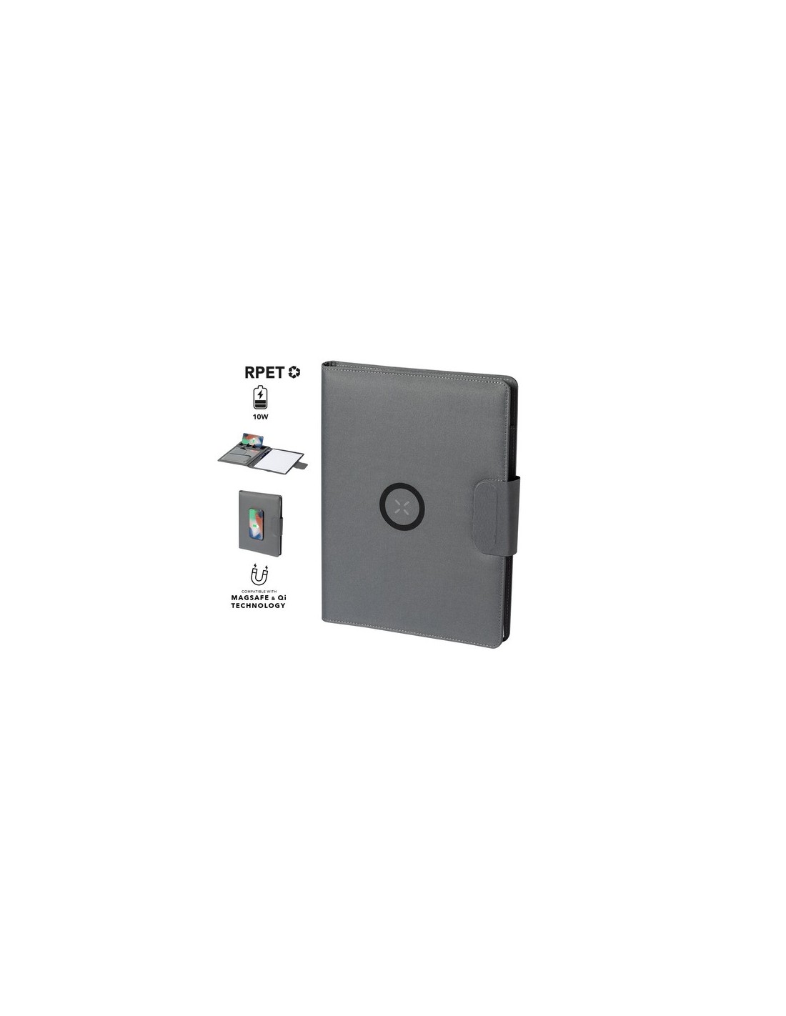 Carpeta/bloc multifunción fabricada en poliéster 300D RPET, elaborado a partir de plástico reciclado, para así fomentar la reutilización de residuos plásticos y ayudar a la sostenibilidad del planeta. Con cierre magnético y etiqueta interior con distintivo RPET. Incluye cargador inalámbrico 10W integrado en portada, con fijación magnética para poder usar el dispositivo mientras se produce la carga del mismo e incluyendo anillo adhesivo, válido para todos los dispositivos con tecnología Magsafe y Qi. Batería integrada de 5.000 mAh de capacidad de carga, con puerto Tipo C de entrada/salida y LEDs indicadores de estado de carga, con cable incluido. Interior con soporte para smartphone y multitud de compartimentos para tarjetas, incluidos soporte para bolígrafo y bloc A4 con 20 hojas de disposición a una raya. Presentada en atractiva caja individual de diseño. Las capacidades mostradas en todas nuestras baterías auxiliares externas son reales, incorporando todas ellas baterías de grado A y no recicladas, con una vida útil de al menos 500 ciclos de carga y según normativa CE. Además, están fabricadas conforme a los estándares RoHS y en cumplimiento con los siguientes requisitos de seguridad: Sistema de protección contra sobrecarga del power bank. Sistema de protección contra descarga completa que proporciona una mayor durabilidad del power bank. Sistema de bloqueo para evitar cortocircuitos. Sistema de transferencia de carga constante, acorde con la capacidad del dispositivo de destino. Cargador Inalámbrico 10W. Power Bank 5000 mAh. Salida USB. Entrada Micro USB. Bloc 20 Hojas Composition : Poliéster 300D RPET.